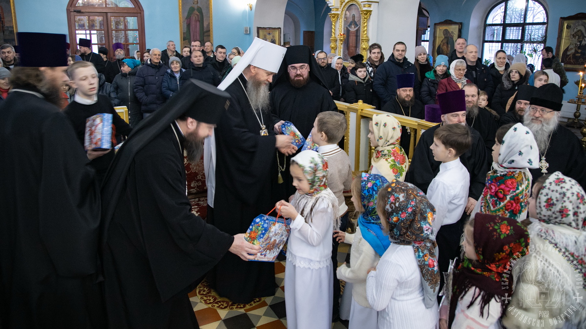 В продолжение всего праздничного вечера, владыка вручал сладкие Рождественские подарки участникам концертных программ.