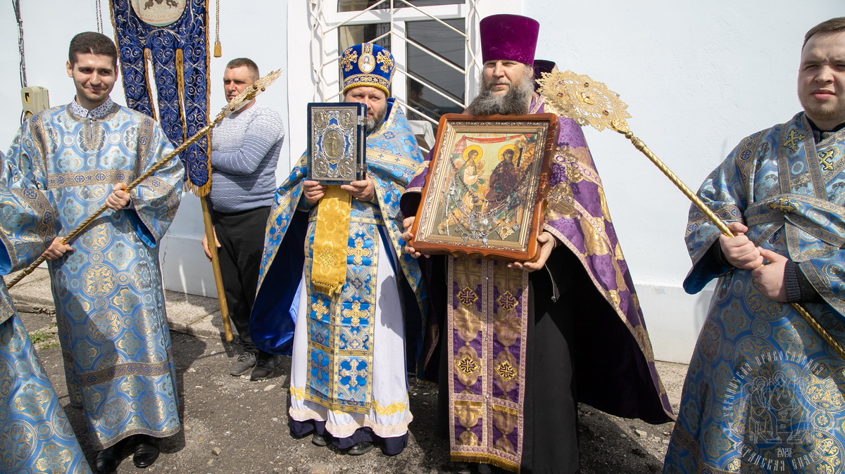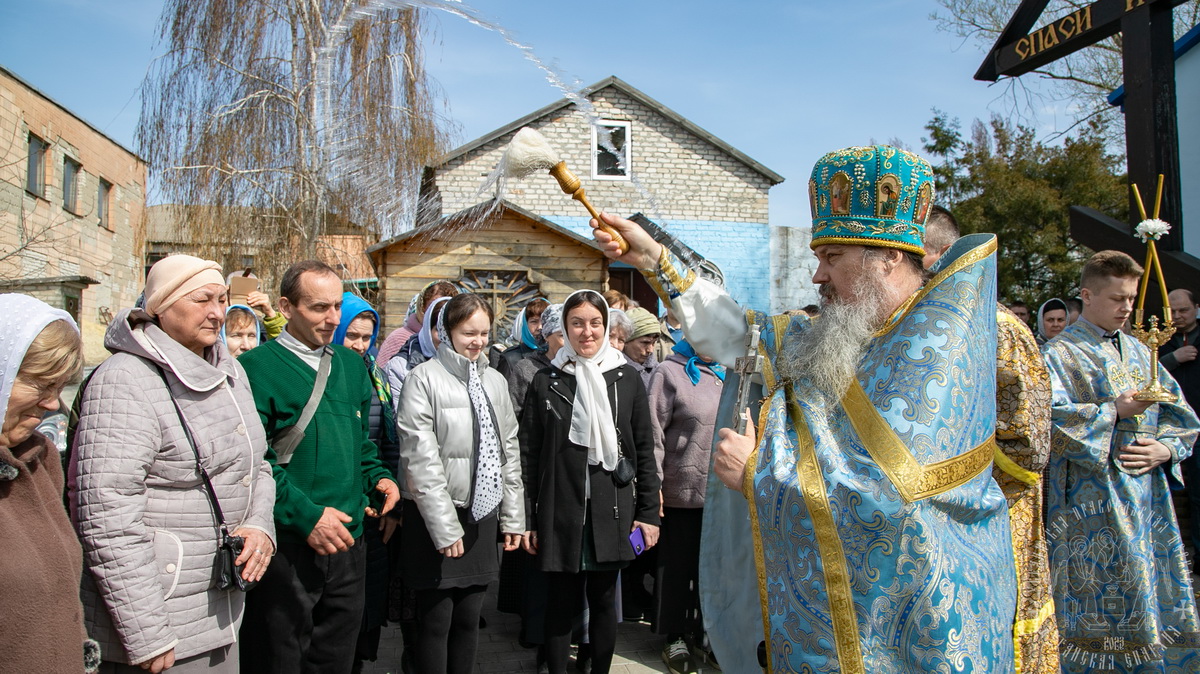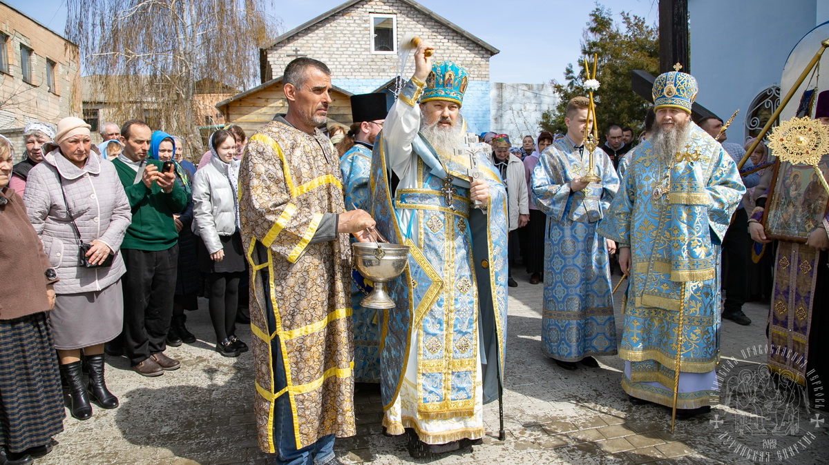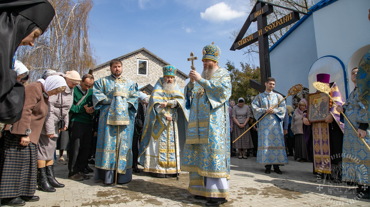 По окончании Литургии духовенство и верующий народ во главе с архиереем прошли крестным ходом вокруг храма, воспевая Пресвятую Богородицу.