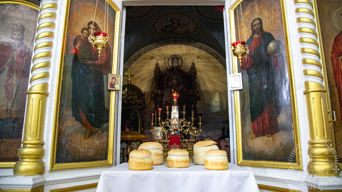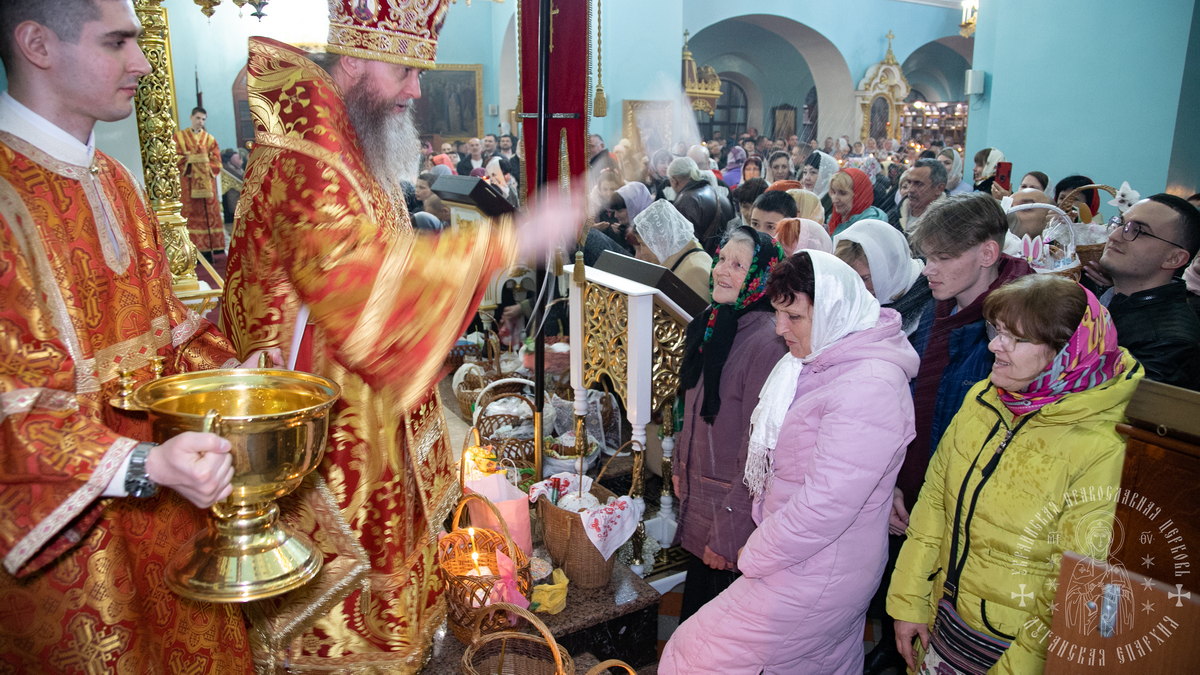 После заамвонной молитвы владыка освятил Артос, поздравил всех с Пасхой Христовой, а затем освятил пасхальные приношения.