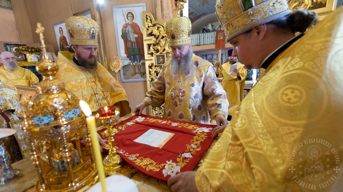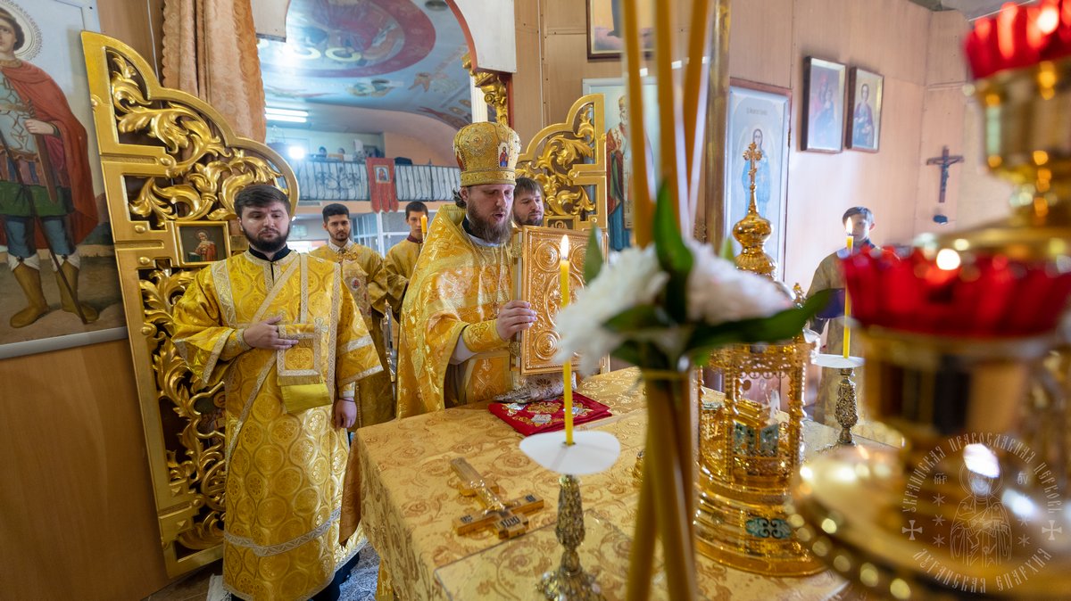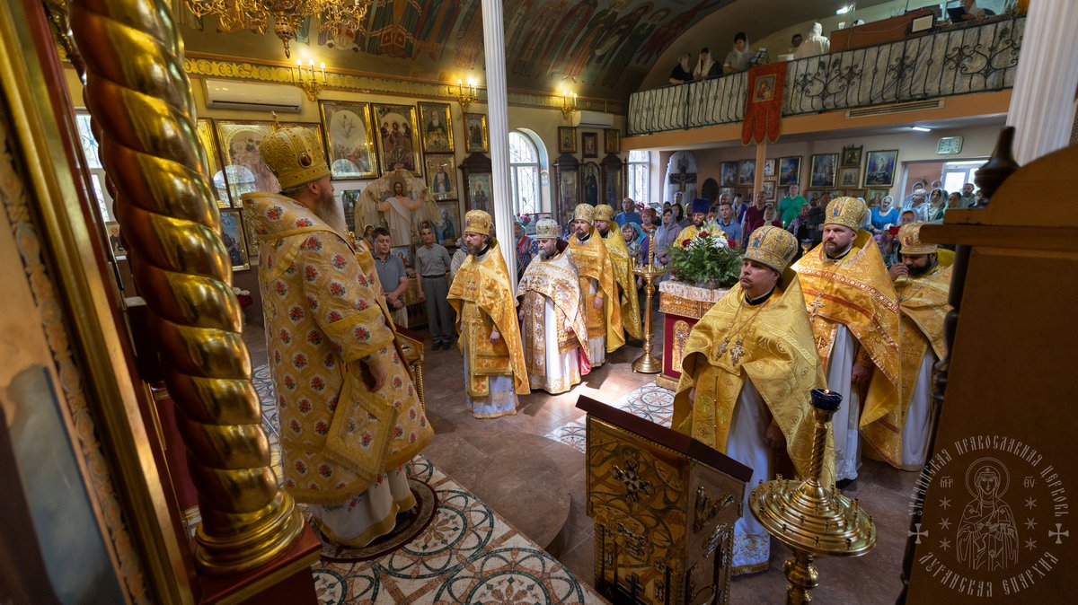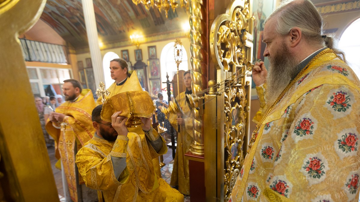 За Литургией Его Высокопреосвященству сослужил секретарь епархии прот. Андрей Зозуля, благочинный центрального городского округа прот. Александр Пономарев, благочинный первого округа архим. Тихон (Ильгов), благочинный Новоайдарского округа прот. Евгений Рогозинский, настоятель храма прот. Александр Беспалов, а также приглашенное духовенство.