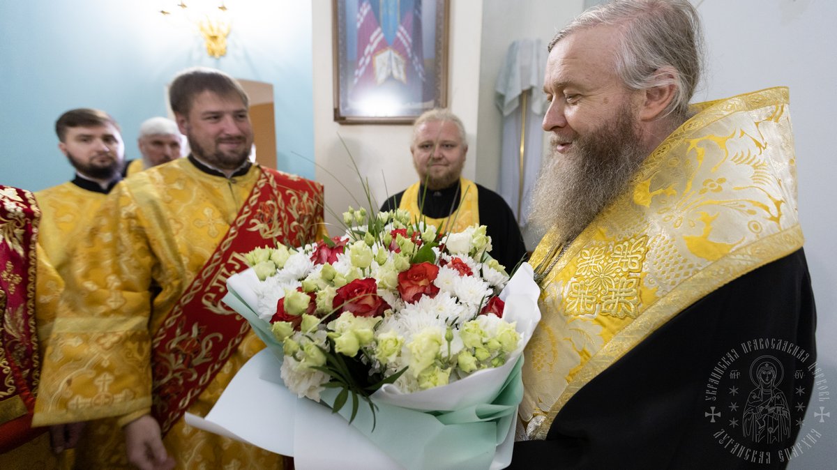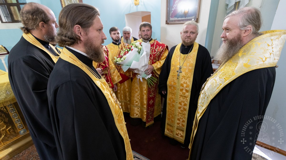 От имени сослужившего духовенства и паствы, митрополит Никодим поздравил правящего архиерея Луганской епархии с престольным днем кафедрального собора, а также с двадцатой годовщиной со дня рукоположения в сан иеромонаха.