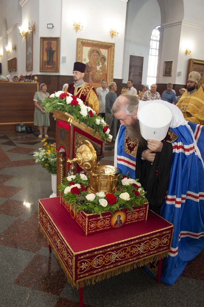 В завершение, владыка Пантелеимон поздравил всех с праздником Крещения Руси и престольным днем кафедрального собора, а также сказал слова поздравлений и добропожеланий в адрес настоятеля собора протоиерея Владимира с Днем тезоименитства и вручил ему богослужебную просфору. после чего архипастырь преподал благословение верующим.