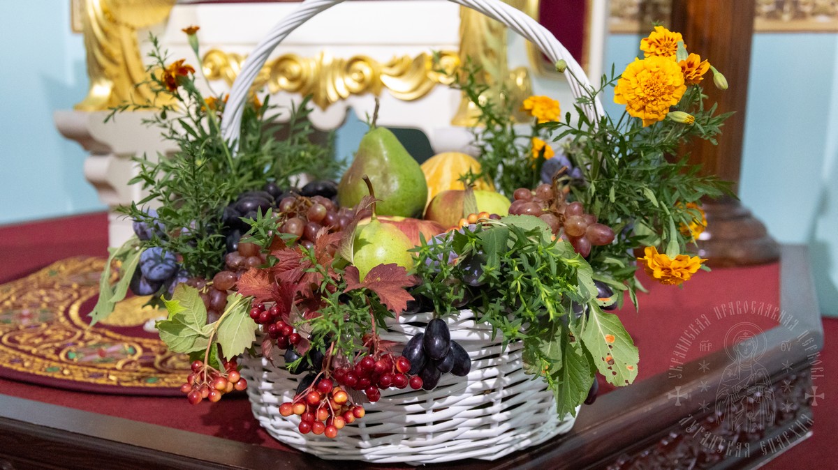По окончании литургии владыка Пантелеимон прочел молитву на освящение плодов нового урожая и окропил их святой водой.