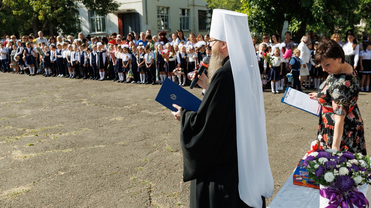 По приглашению директора средней общеобразовательной школы № 12 Елены Владимировны Додоновой, владыка присутствовал на школьной линейке, во время которой первый звонок прозвучал для самых юных учеников.