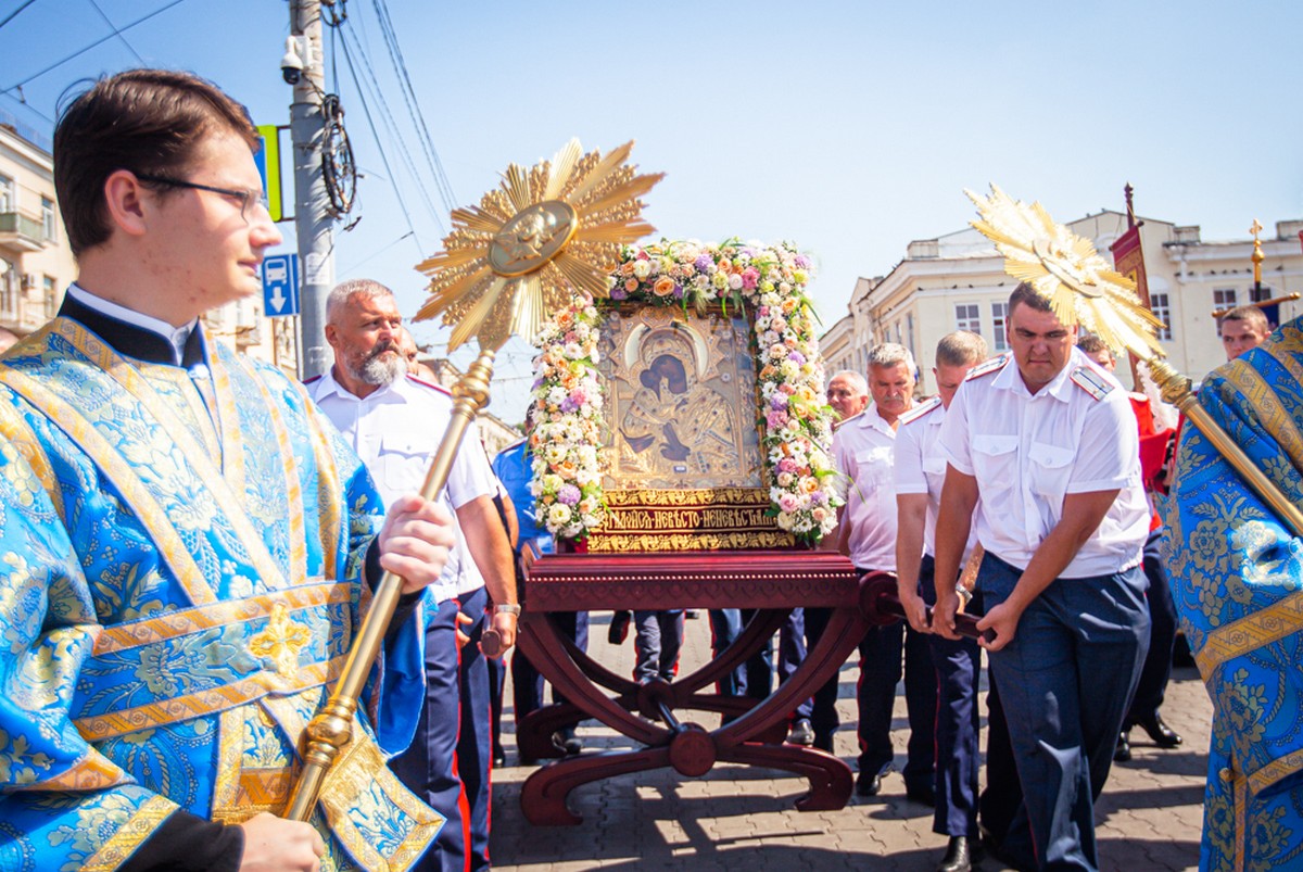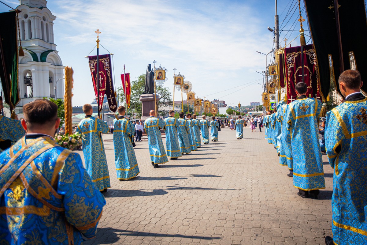 По окончании богослужения был совершен крестный ход с Донским образом Пресвятой Богородицы на Соборную площадь к памятнику святителя Димитрия, митрополита Ростовского.