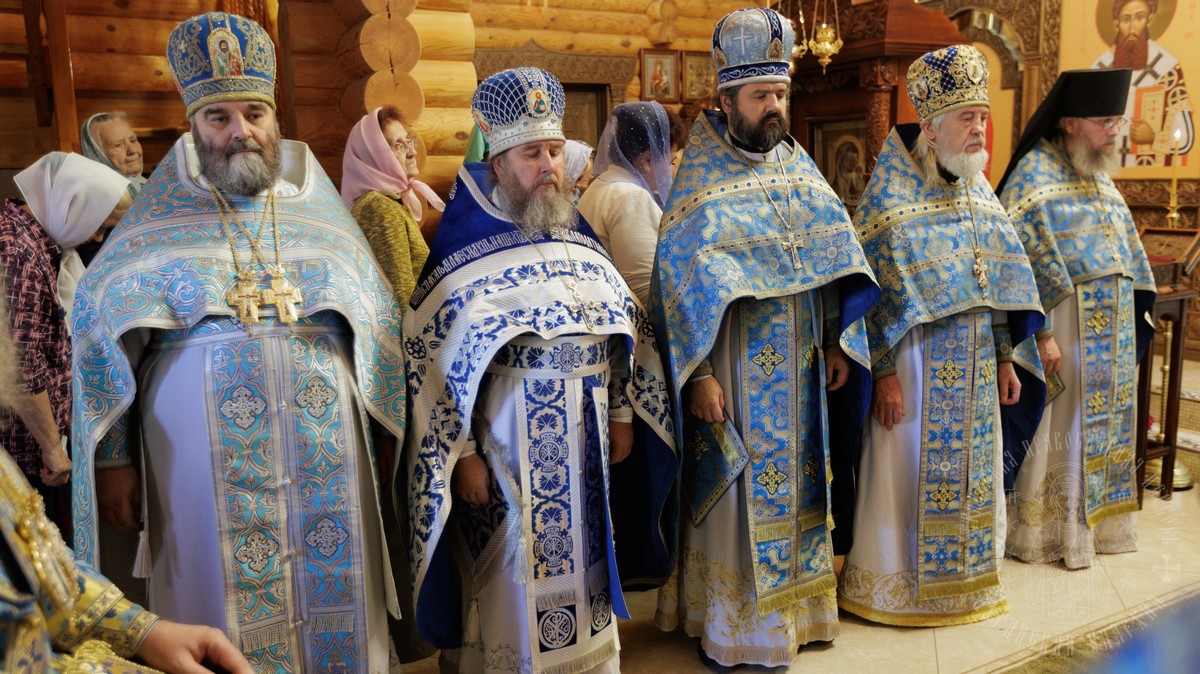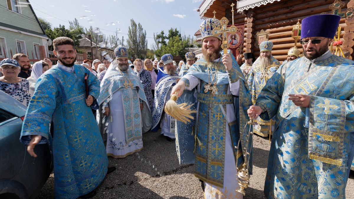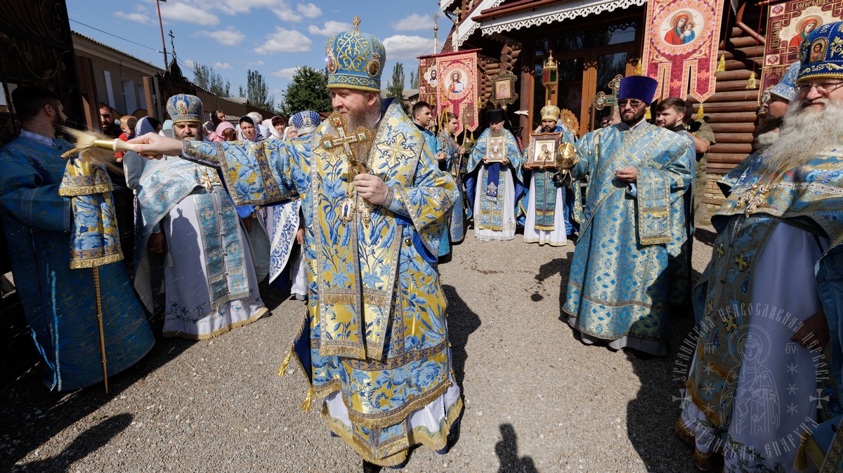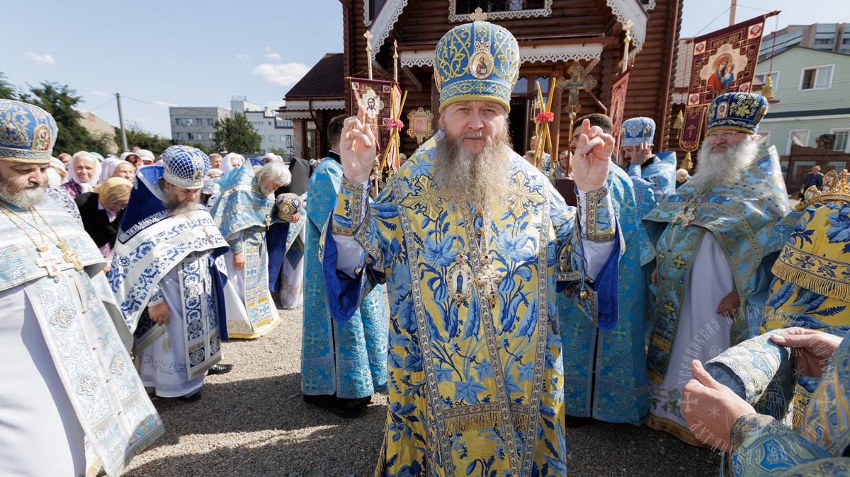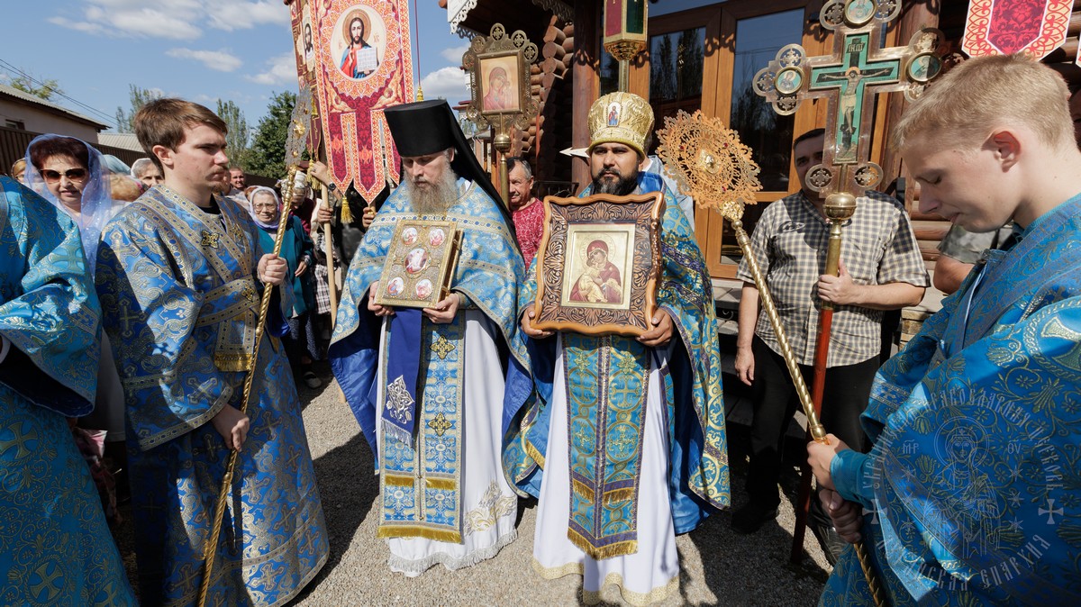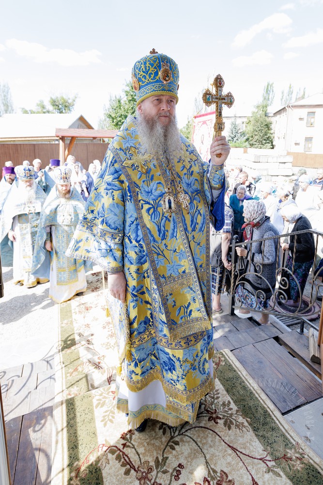 По окончании Литургии, владыка вместе с духовенством прошел крестным ходом вокруг храма, прославляя в молитвах Царицу Небесную и окропляя верующих святой водой.