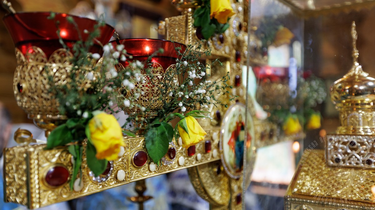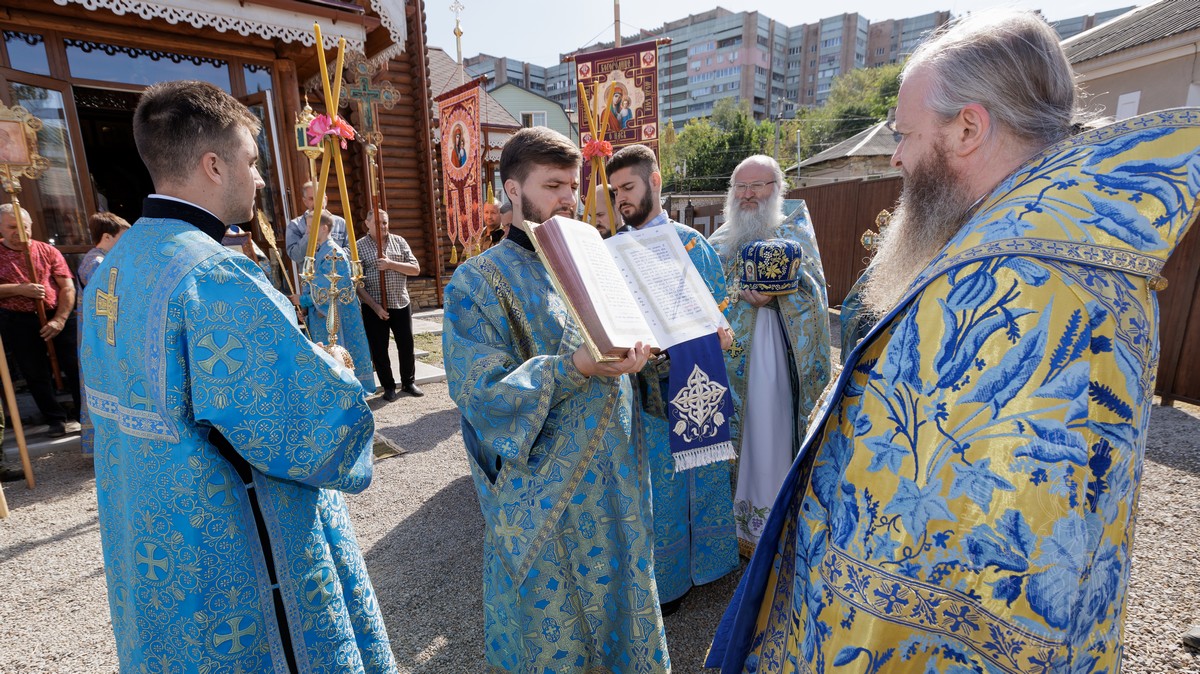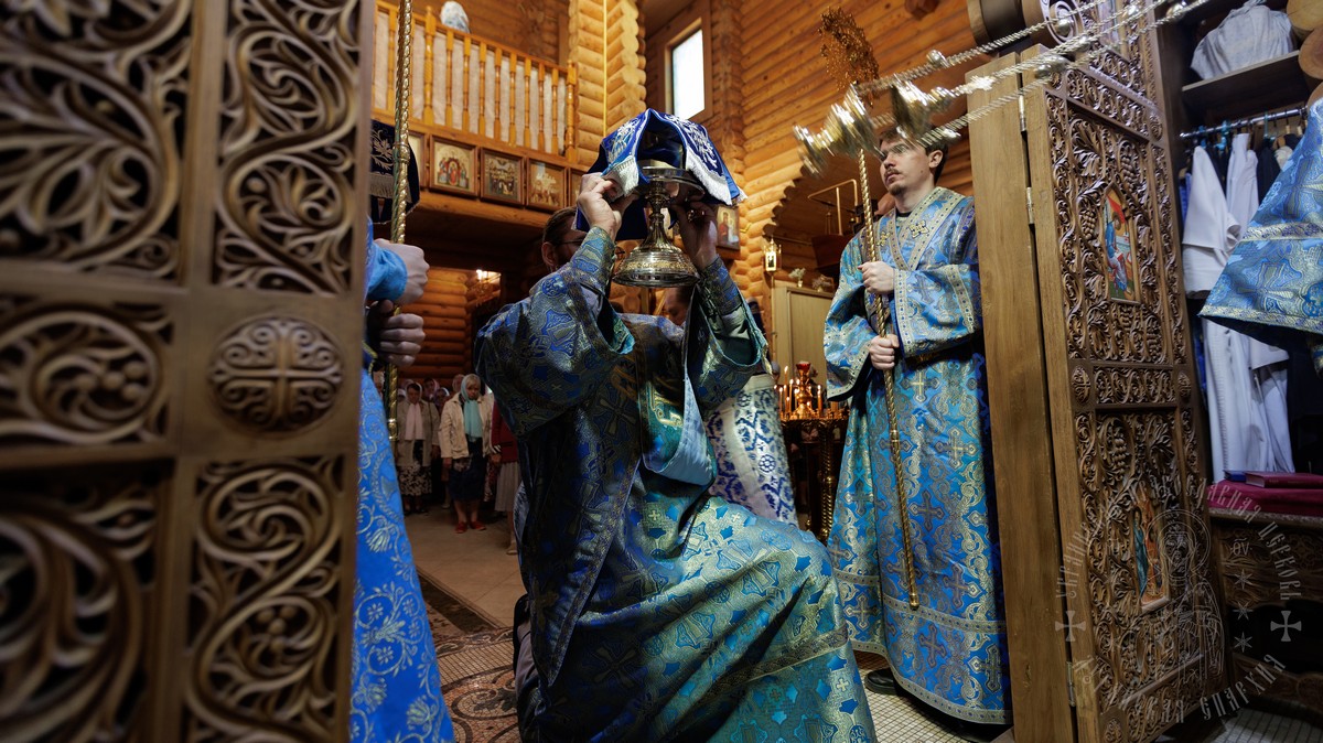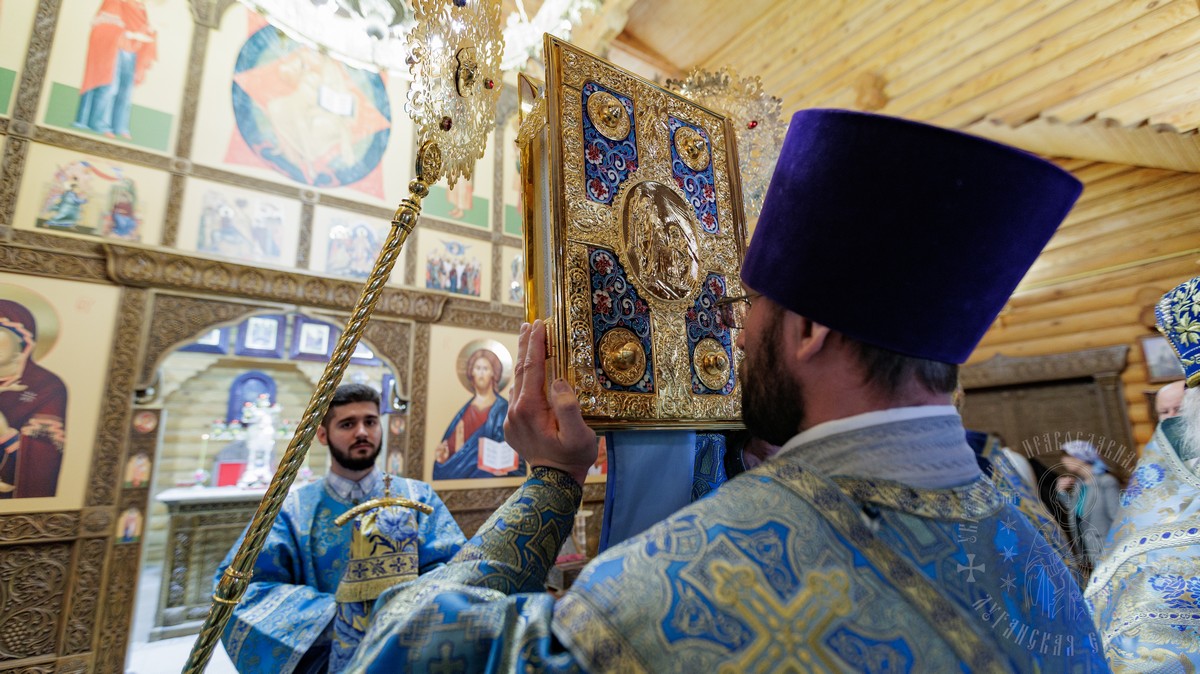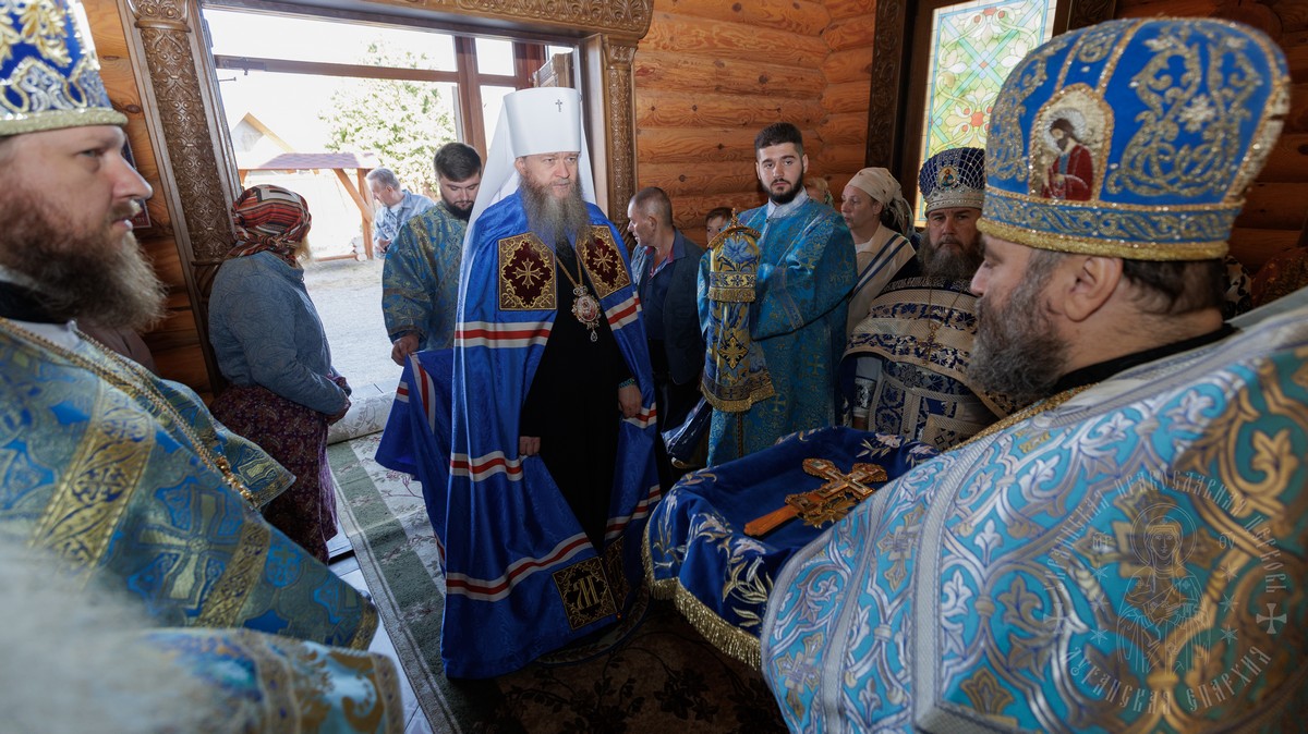 По окончании Литургии, владыка вместе с духовенством прошел крестным ходом вокруг храма, прославляя в молитвах Царицу Небесную и окропляя верующих святой водой.