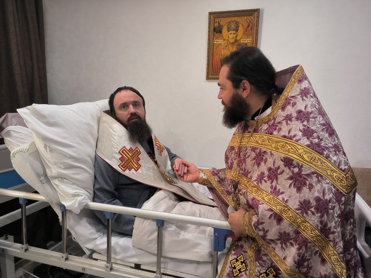 Для того, чтобы иметь возможность быть причастным к Таинству Евхаристии, владыка молится за Литургией, которую совершает его ближайший помощник – настоятель храма Иверской иконы Божией Матери архим. Сергий Громовик.