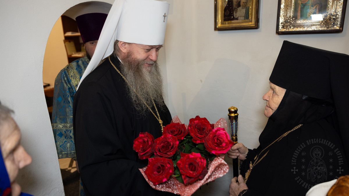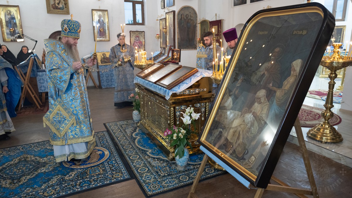 Перед началом Литургии в храме обители торжественно встретили ковчег с частицами мощей: свят. Афанасия патриарха Константинопольского, свт. Мелетия архиеп. Харьковского, сщмч. Александра архиеп. Харьковского, а также икону Рождества Пресвятой Богородицы из ризницы кафедрального собора, которые владыка передал в дар монастырю.