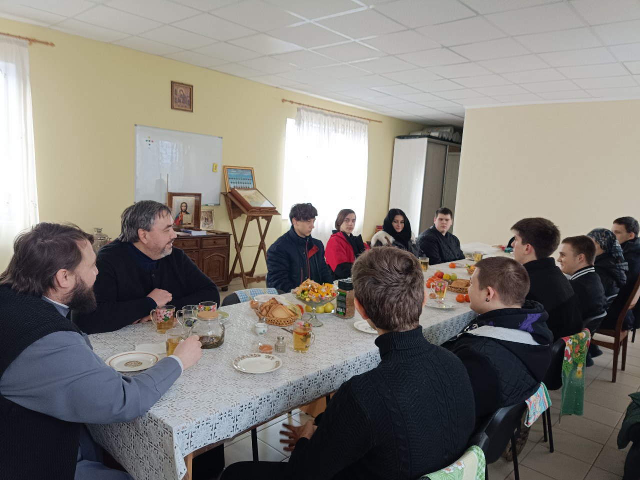 Завершили встречу с молодежью дружеской беседой в трапезной храма за чашкой горячего чая.