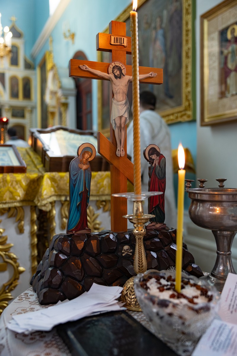 Накануне, на Утрени, владыка Пантелеимон совершил Парастас. Особенностью Парастаса, помимо особых заупокойных стихир и тропарей, является стихословие в притворе храма 17 кафизмы с особыми припевами. Эта кафизма разделяется на две части, после каждой из которых произносится заупокойная ектения — особое моление о усопших.