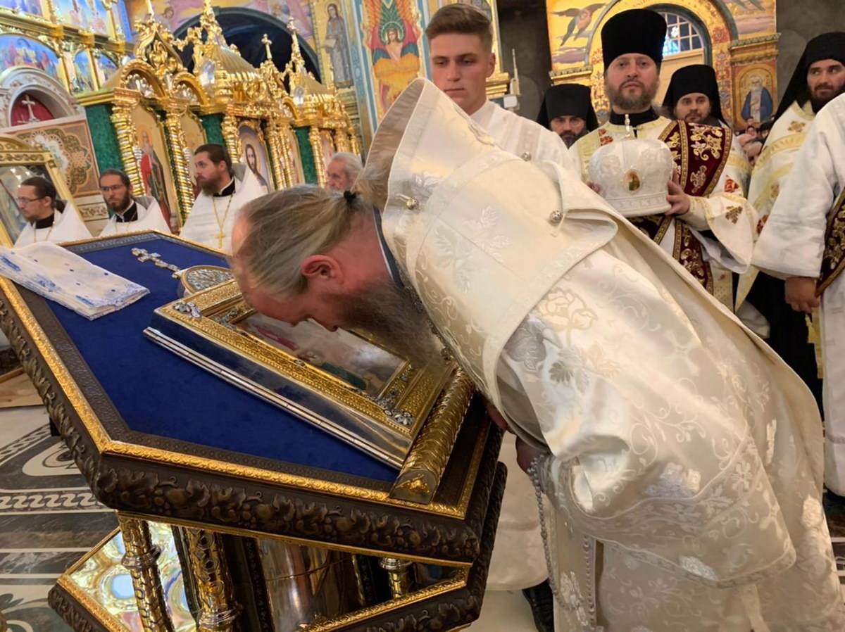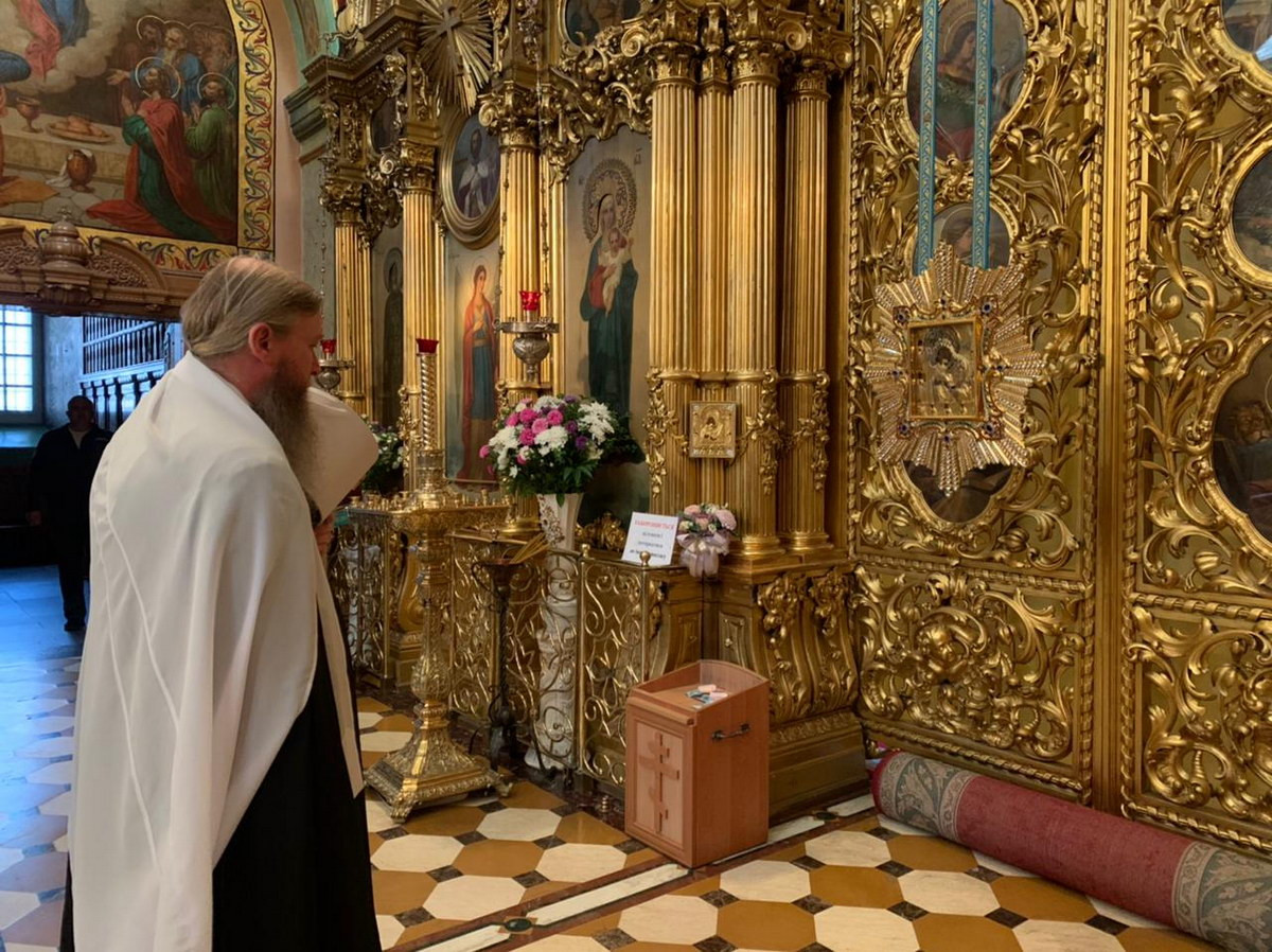 Утром, до начала Литургии, архипастырь приложился к лаврским святыням.