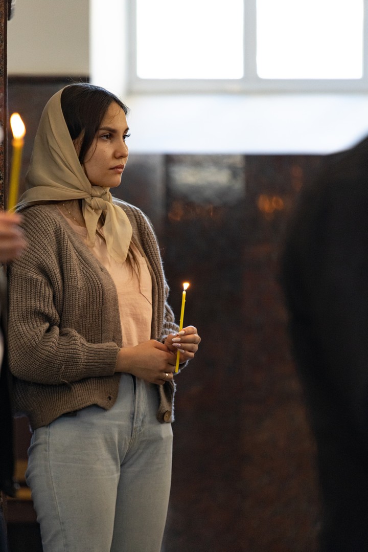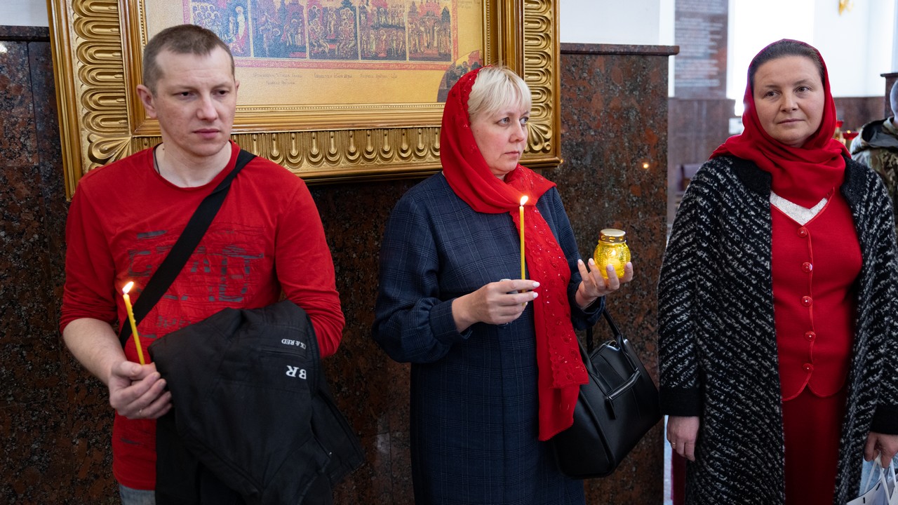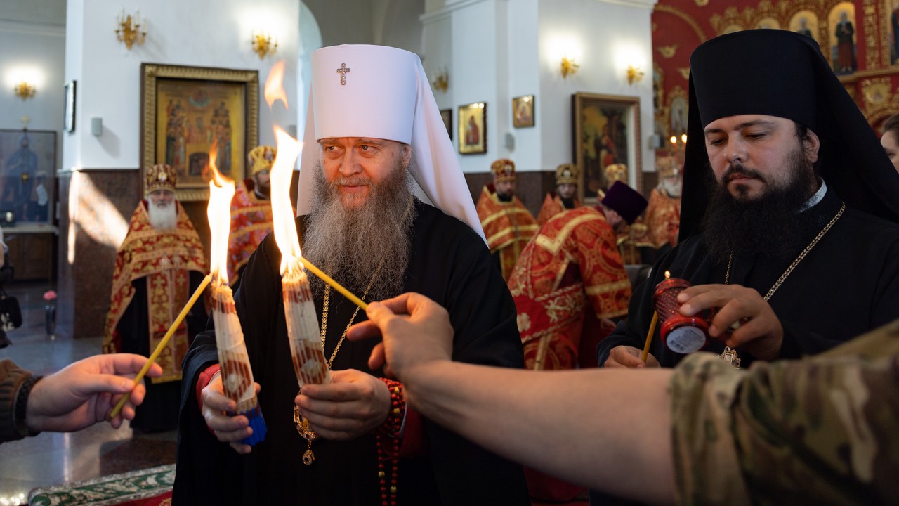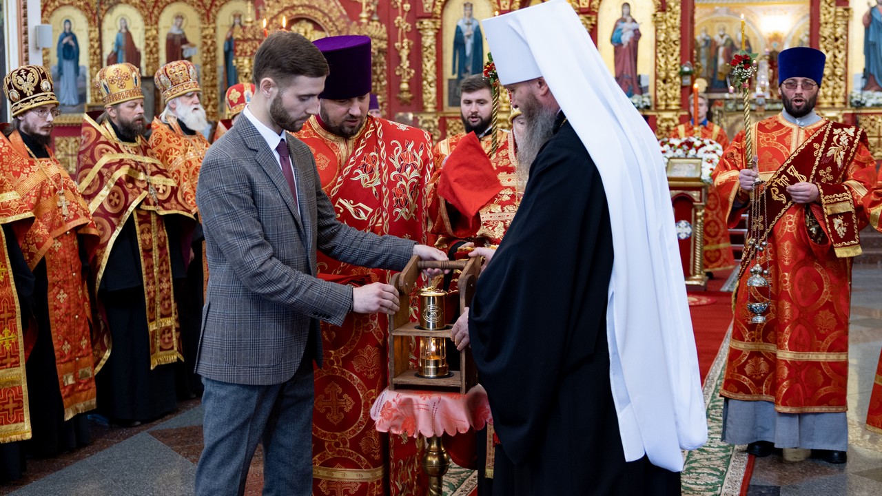 Перед началом богослужения, владыка раздал молящимся свечи возженные от благодатного огня, который был доставлен в Луганск трудами центра развития социально-значимых проектов «Святые Лавры Руси Православной».