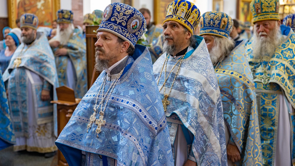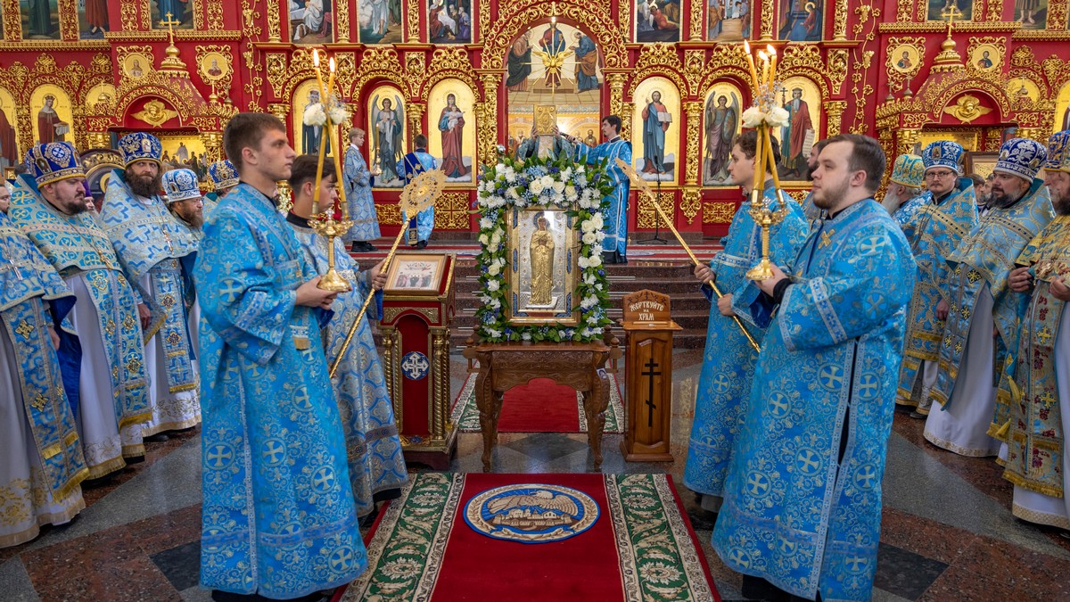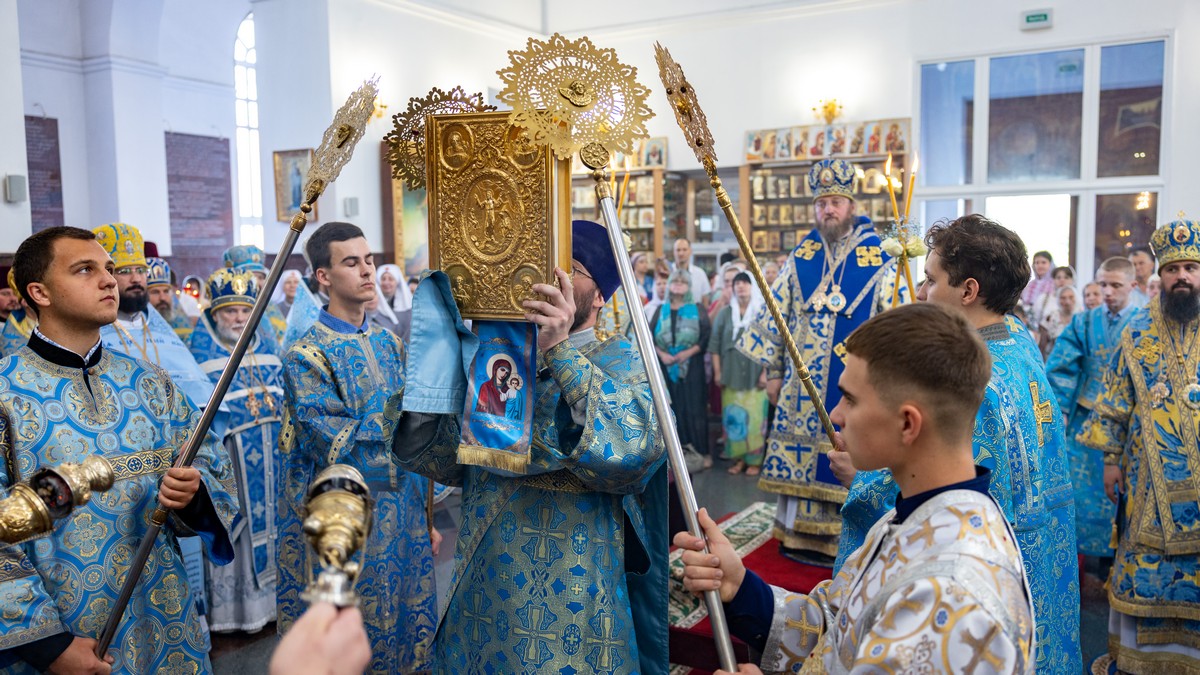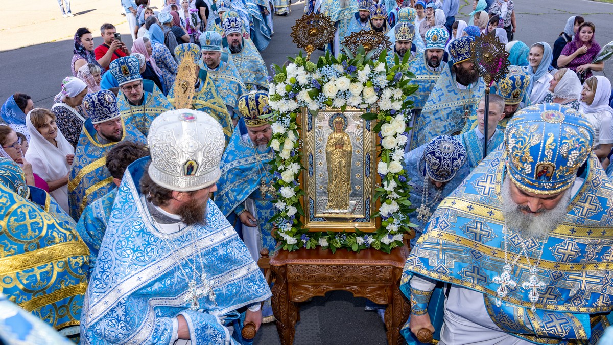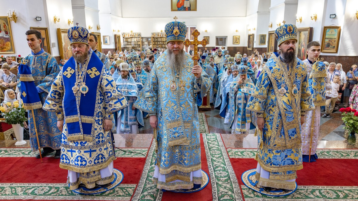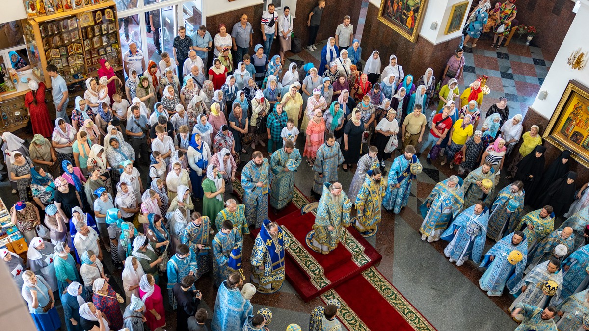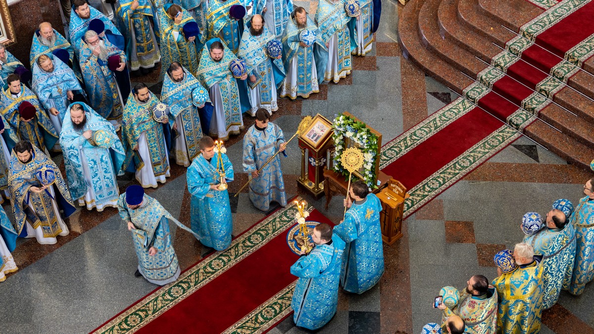 По окончании Литургии архипастыри, духовенство и верующий народ прошли крестным ходом вокруг собора, прославляя в молитвенных песнопениях Царицу Небесную.