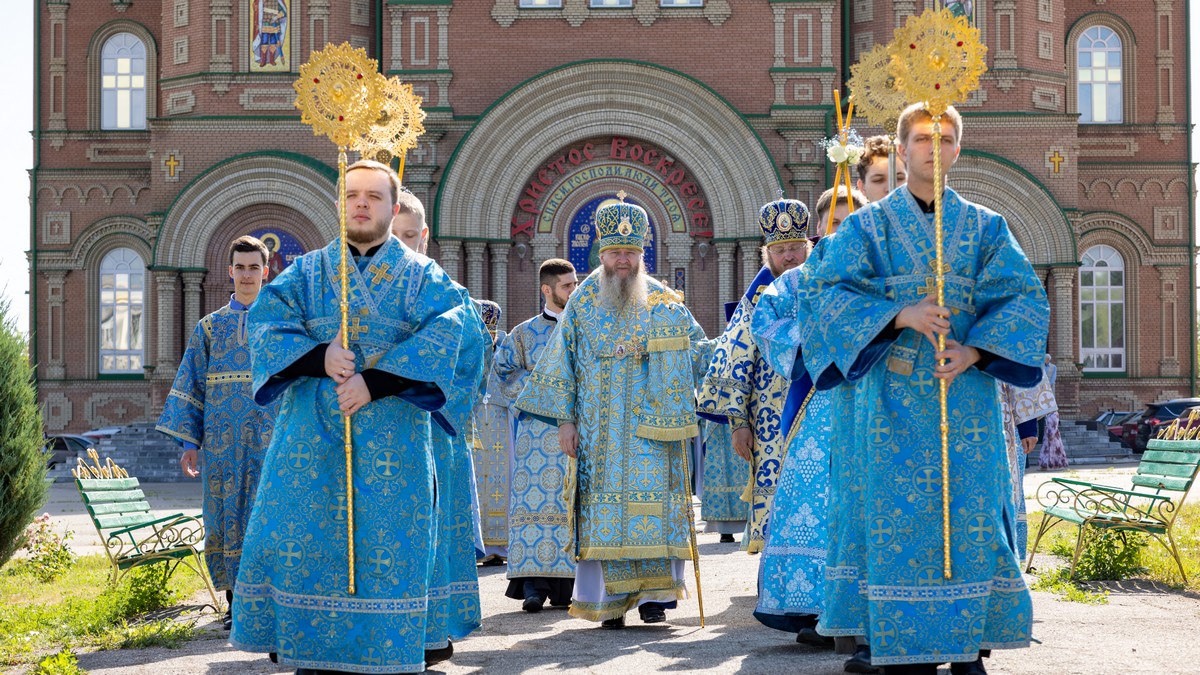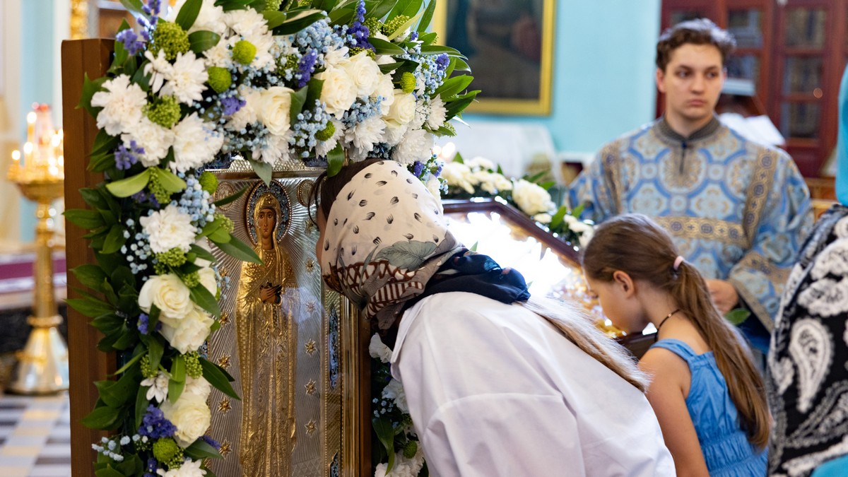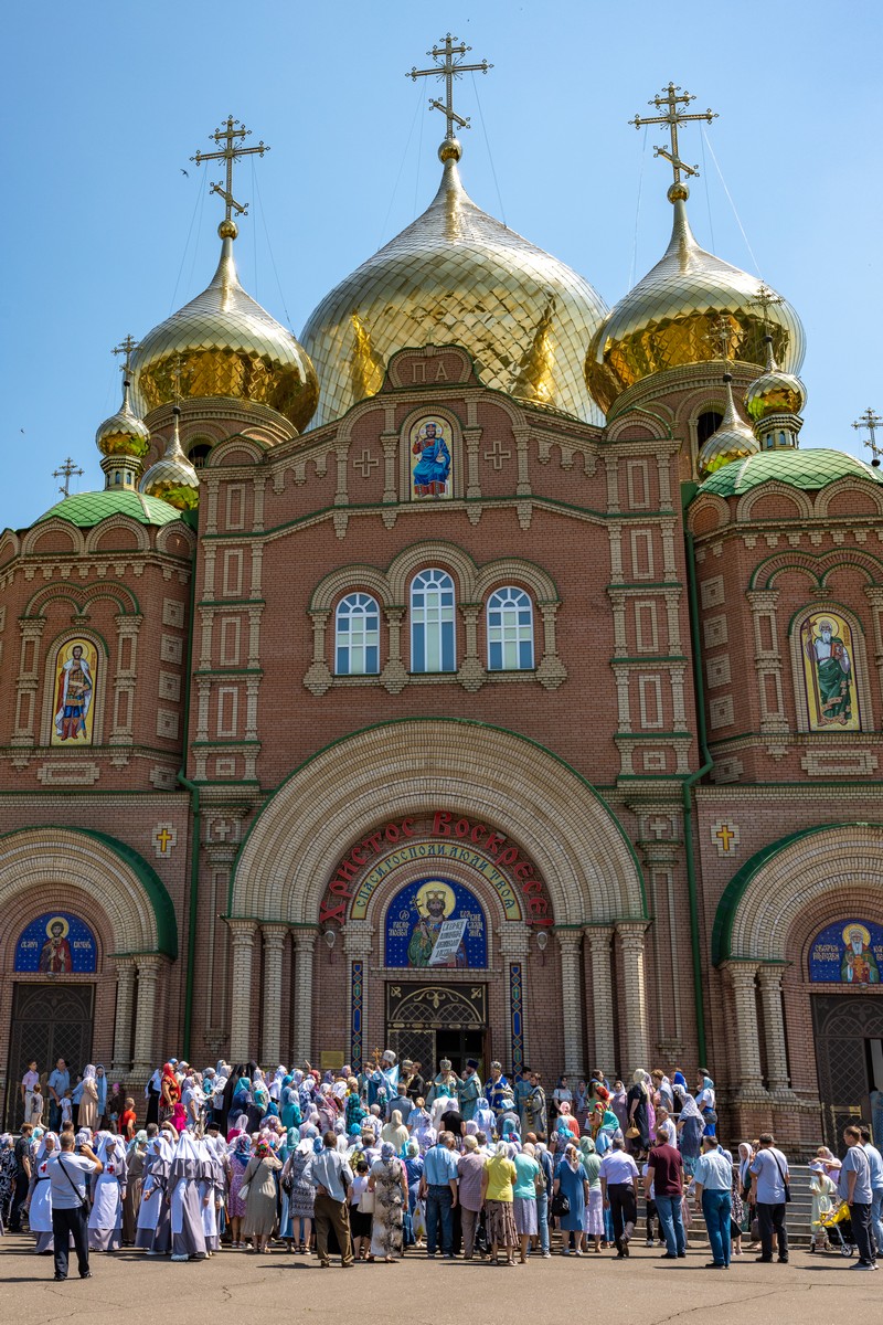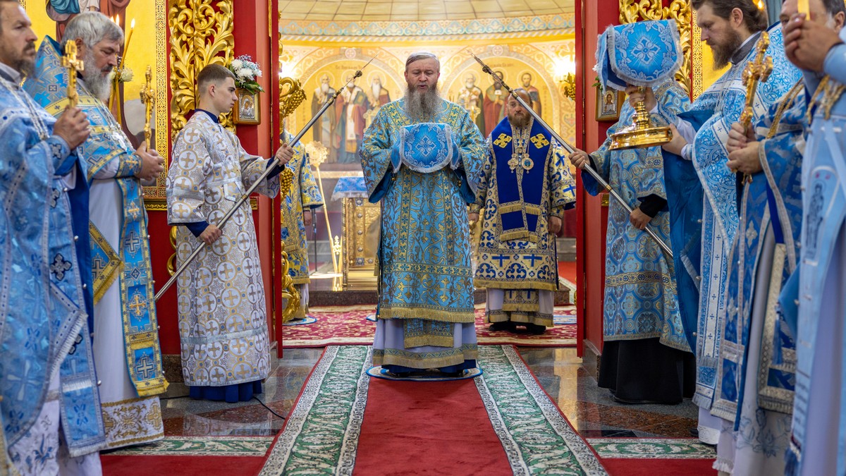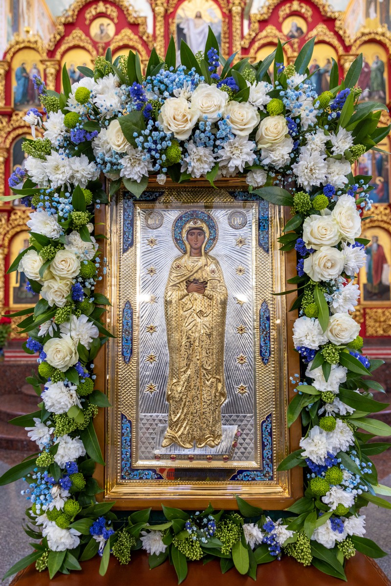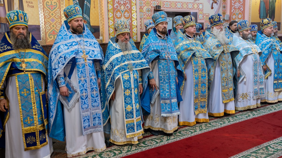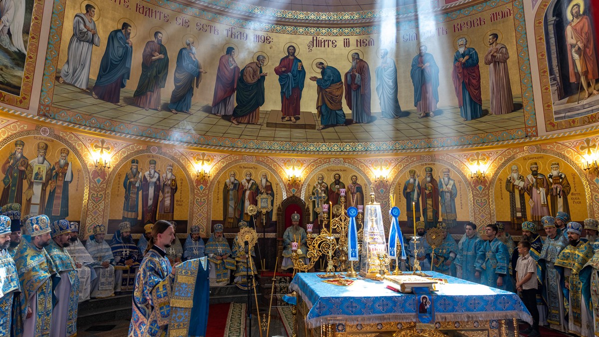 По окончании Литургии архипастыри, духовенство и верующий народ прошли крестным ходом вокруг собора, прославляя в молитвенных песнопениях Царицу Небесную.