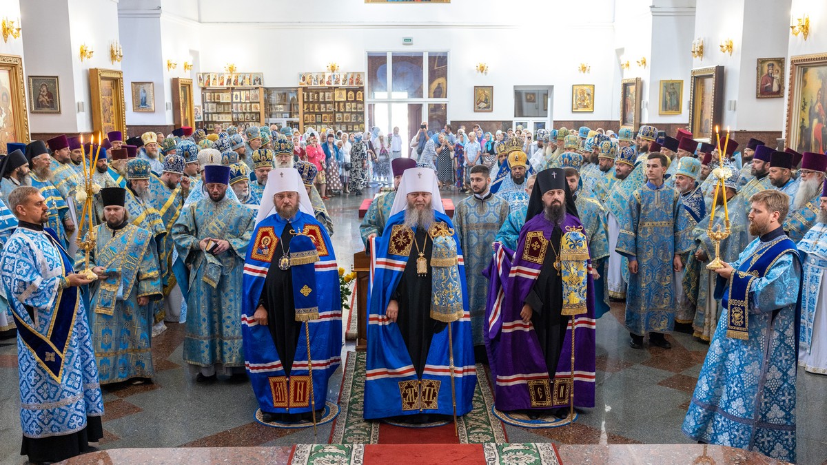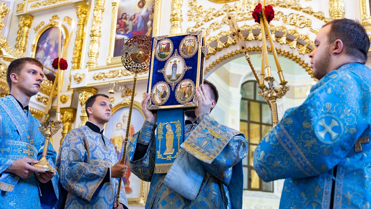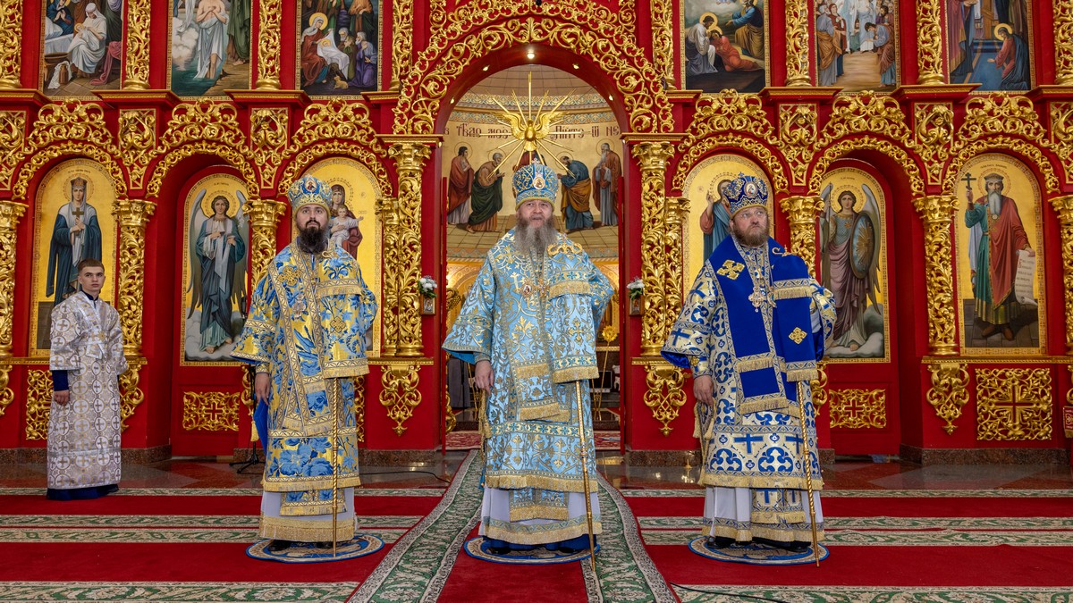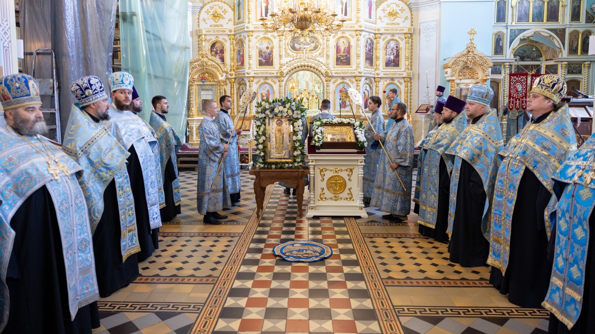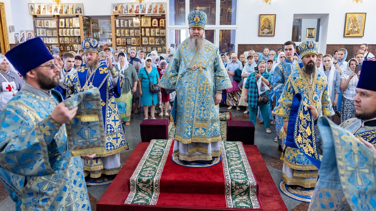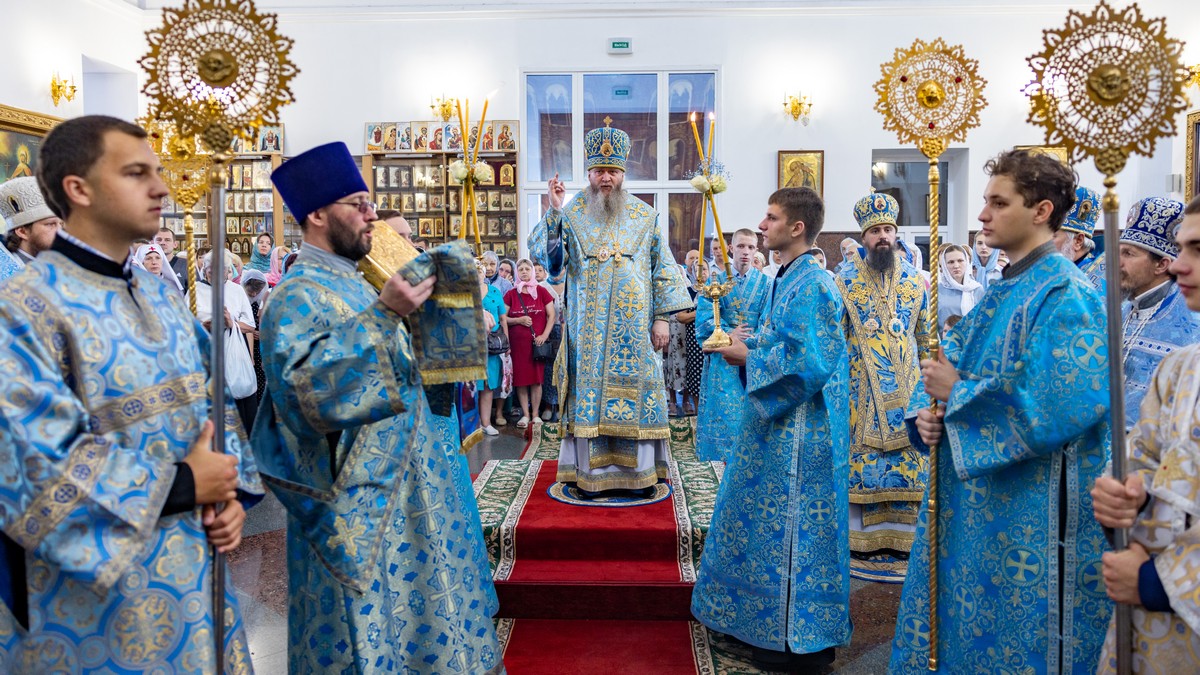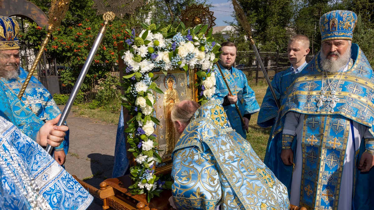 По окончании Литургии архипастыри, духовенство и верующий народ прошли крестным ходом вокруг собора, прославляя в молитвенных песнопениях Царицу Небесную.