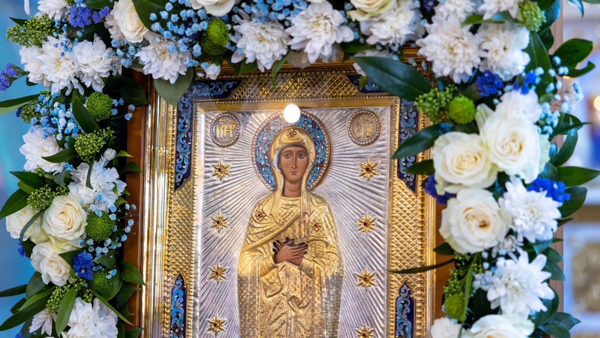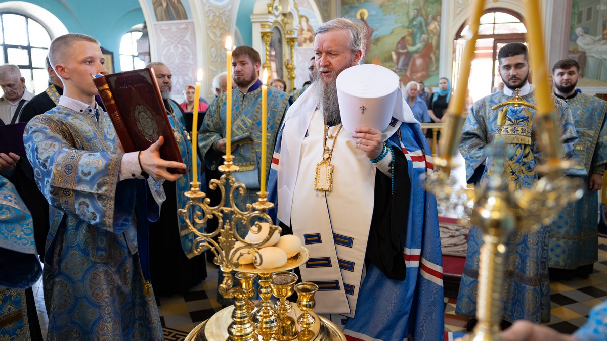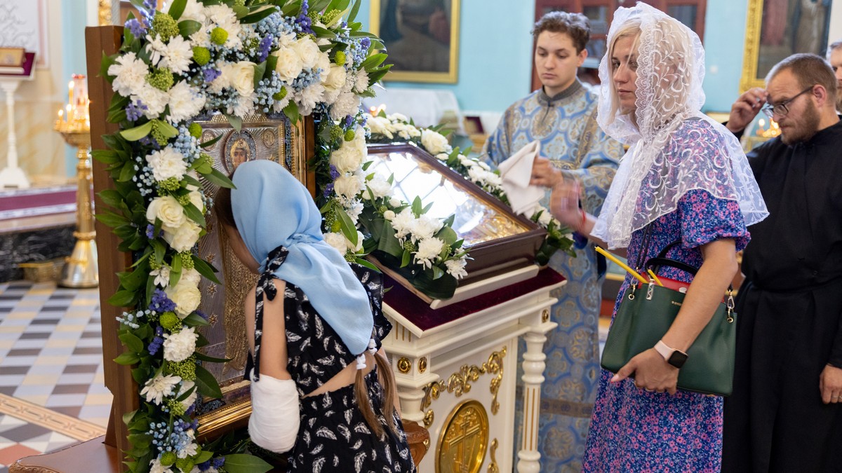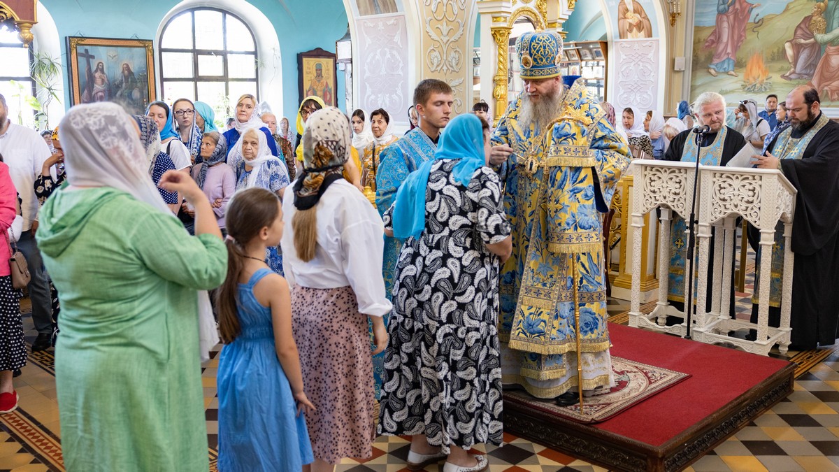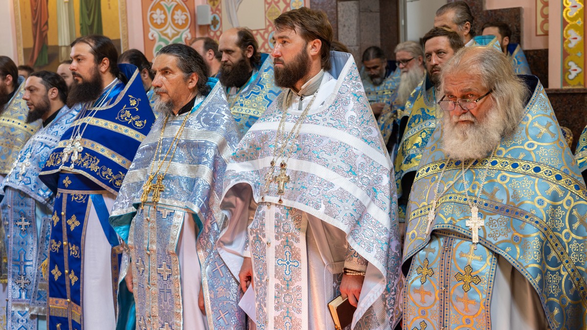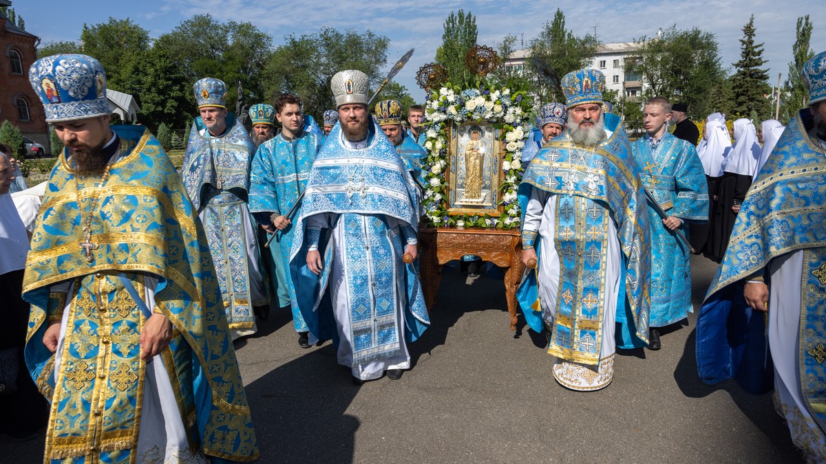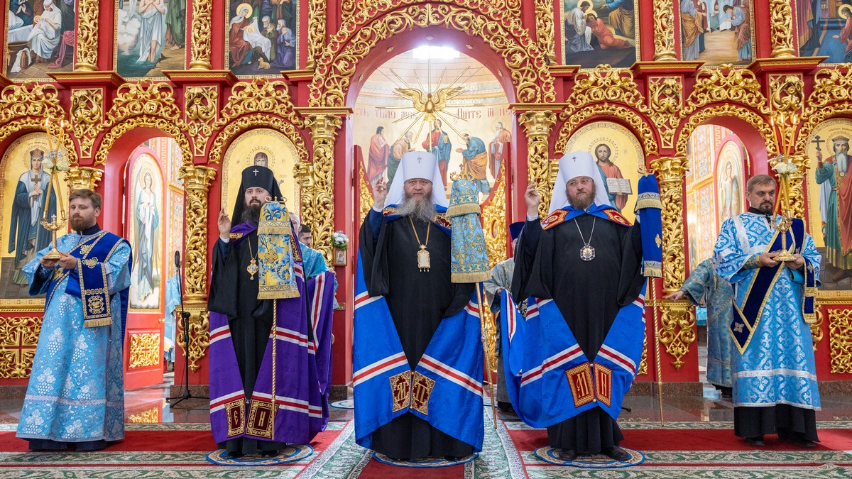 По окончании Литургии архипастыри, духовенство и верующий народ прошли крестным ходом вокруг собора, прославляя в молитвенных песнопениях Царицу Небесную.