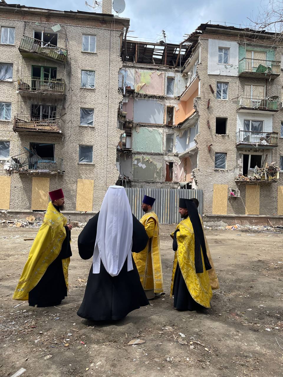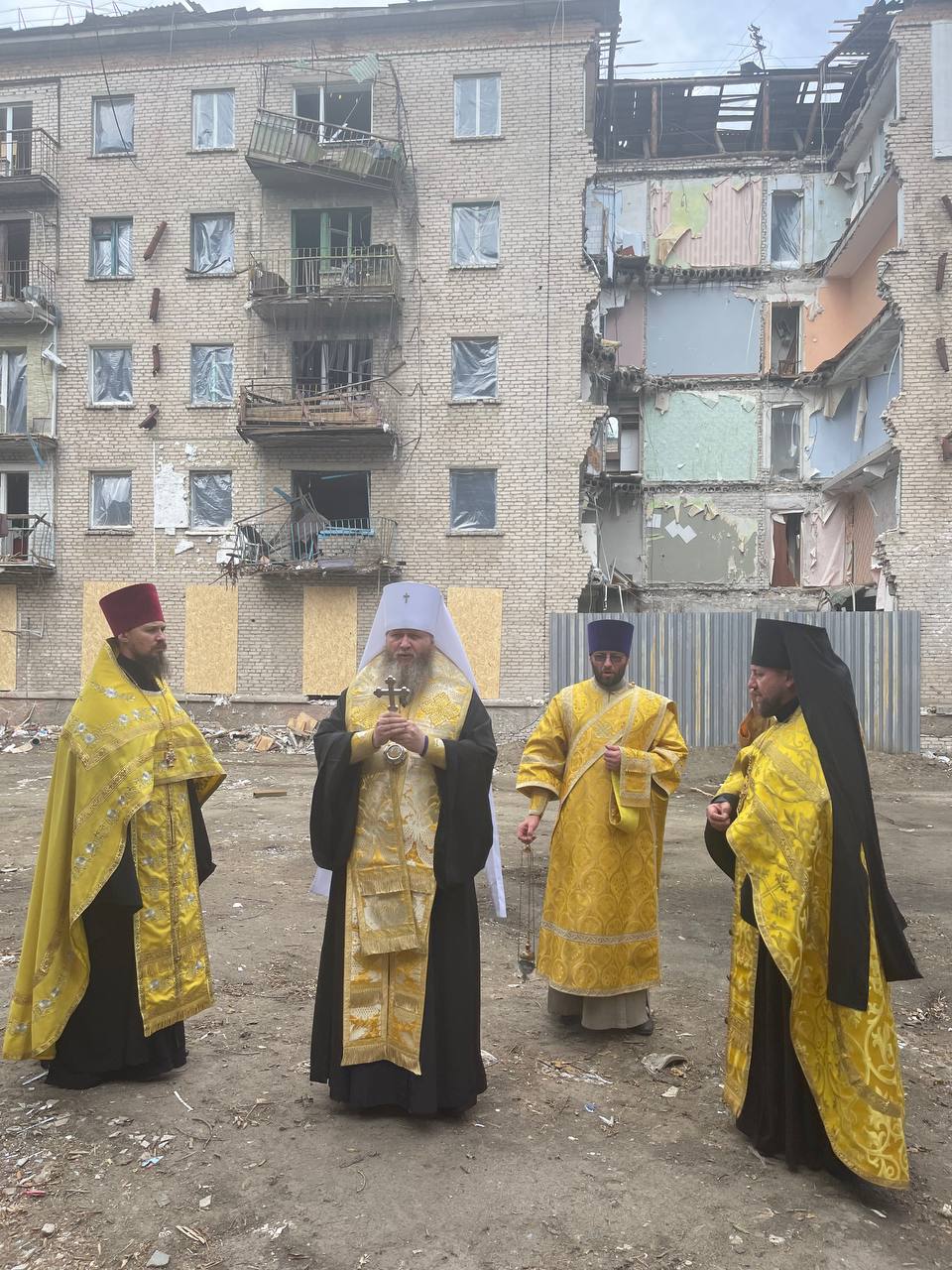Затем, архипастырь в сослужении руководителя гуманитарного отдела епархии прот. Александра Беспалова, совершил заупокойную литию на месте трагической гибели жителей Луганска в результате ракетного удара.