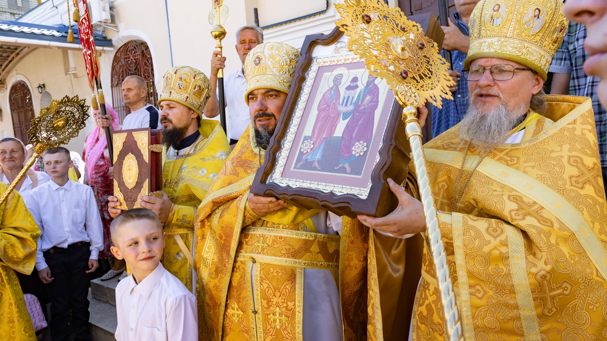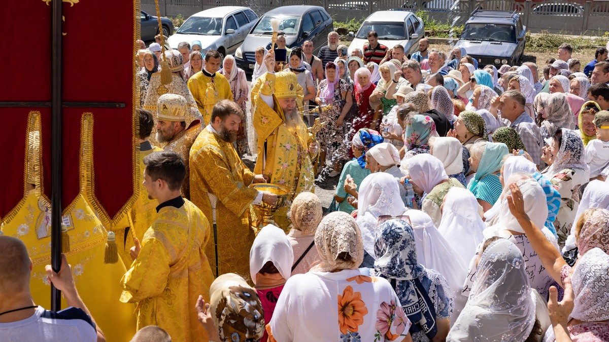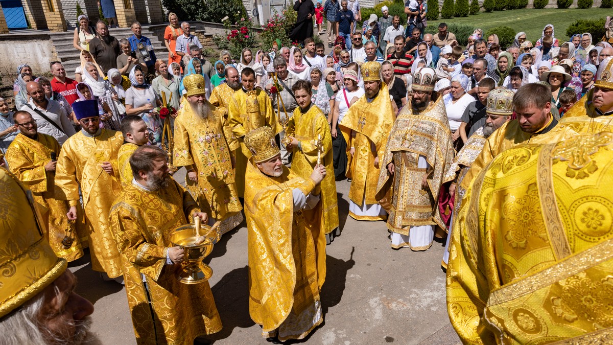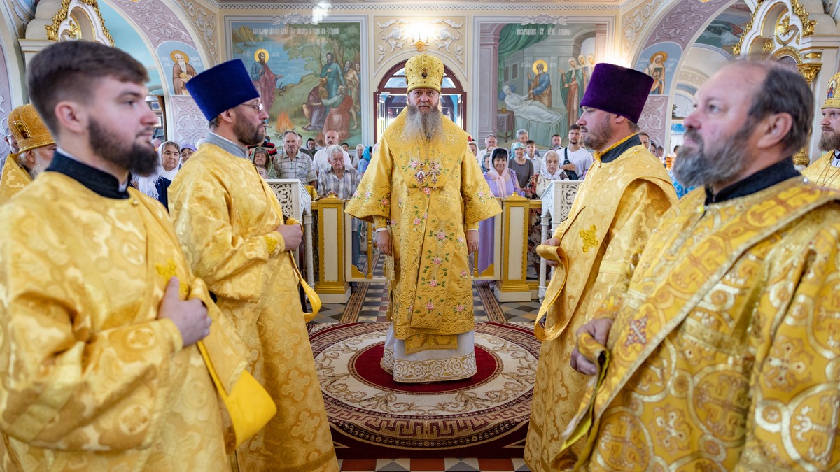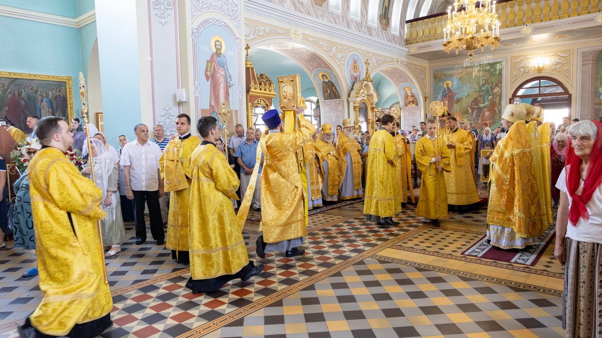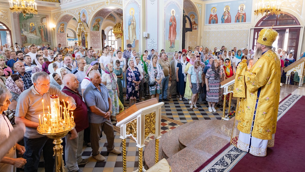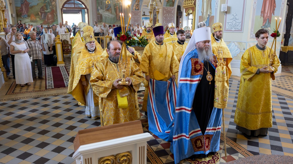 По окончании Божественной Литургии, владыка, духовенство и верующий народ совершили крестный ход вокруг храма, во время которого молились святым покровителям собора.