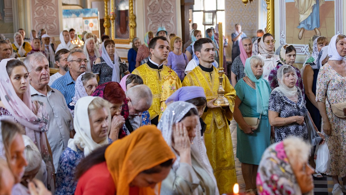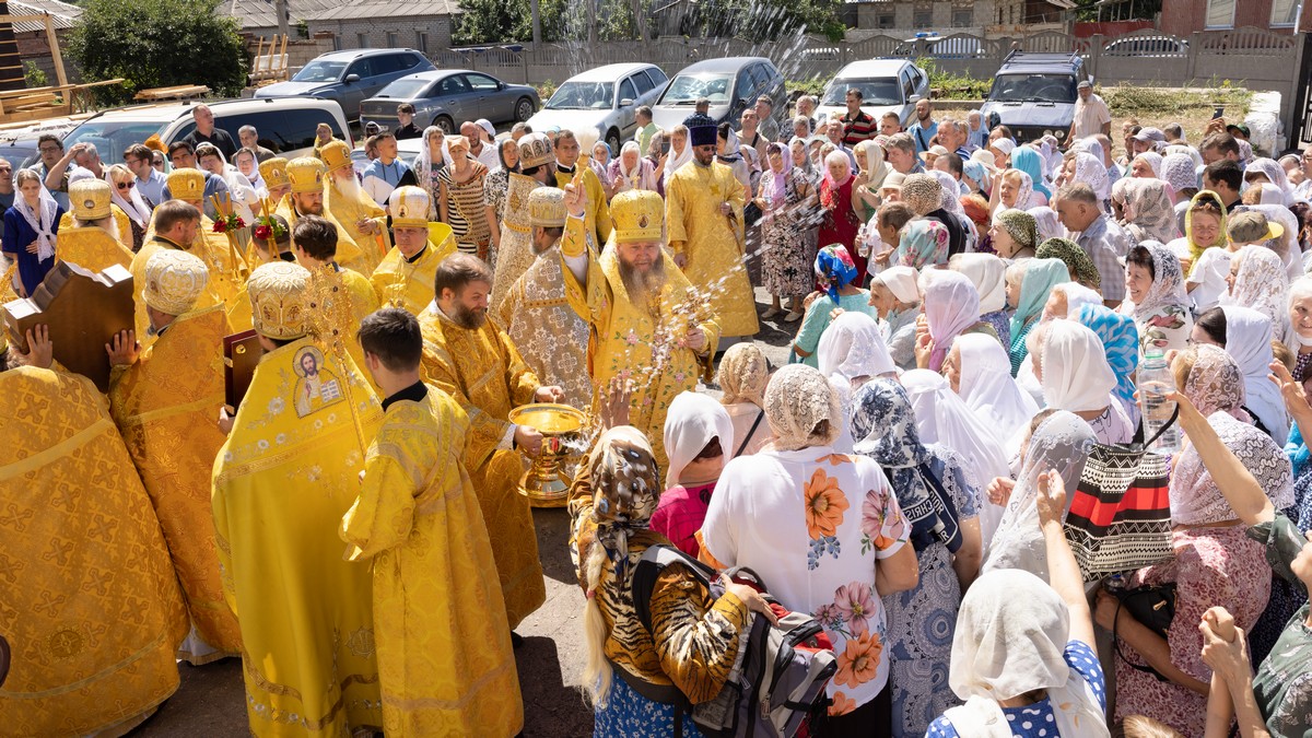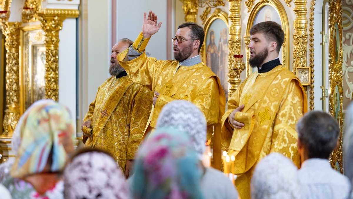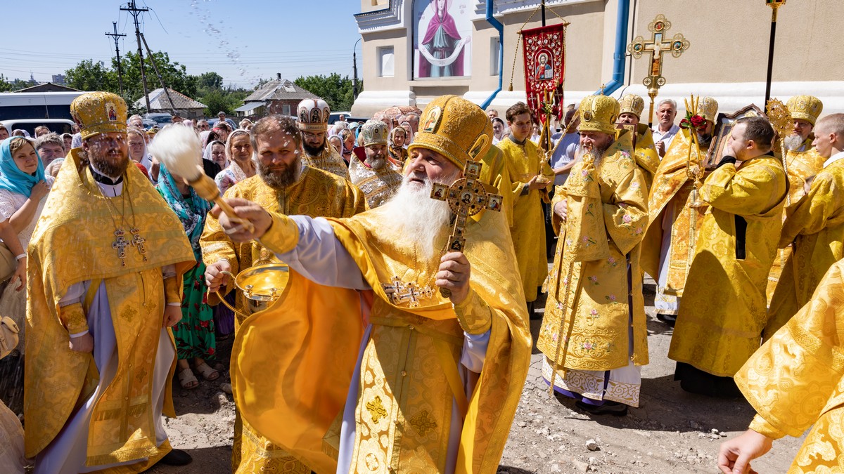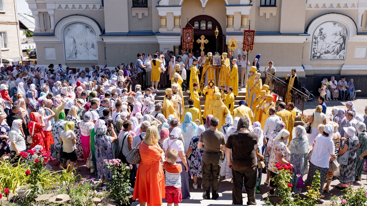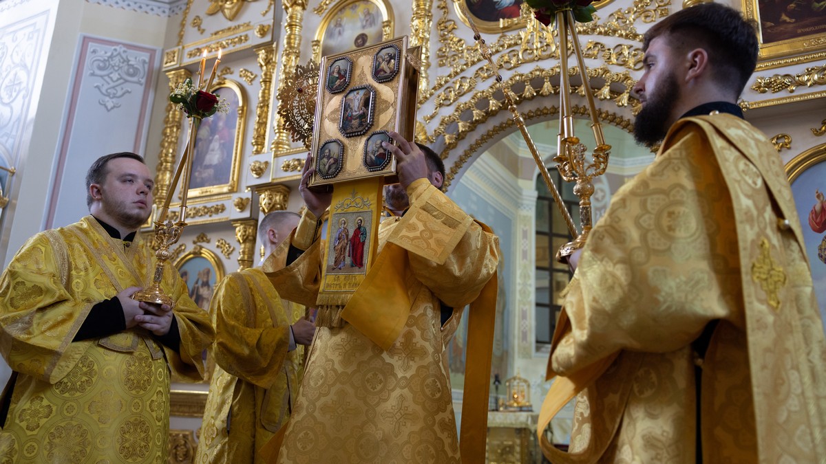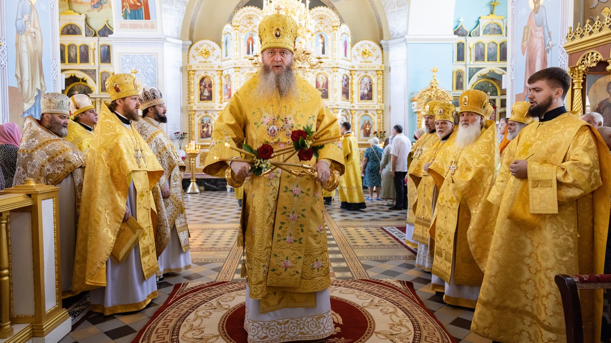 По окончании Божественной Литургии, владыка, духовенство и верующий народ совершили крестный ход вокруг храма, во время которого молились святым покровителям собора.