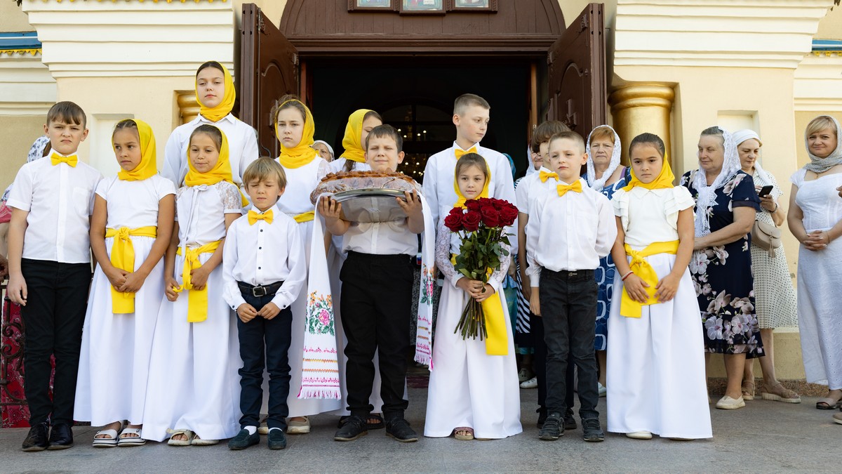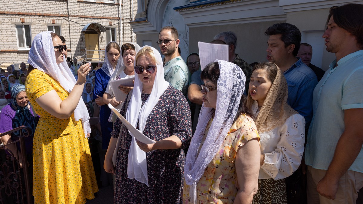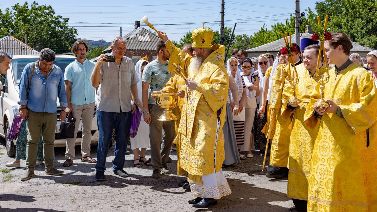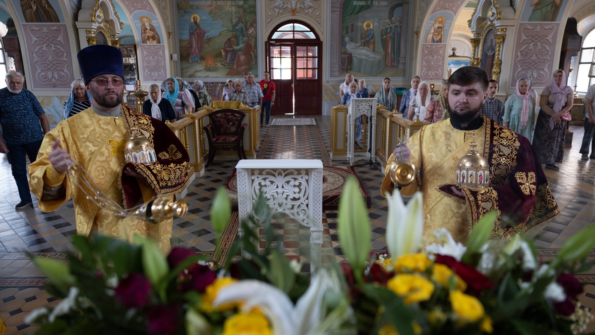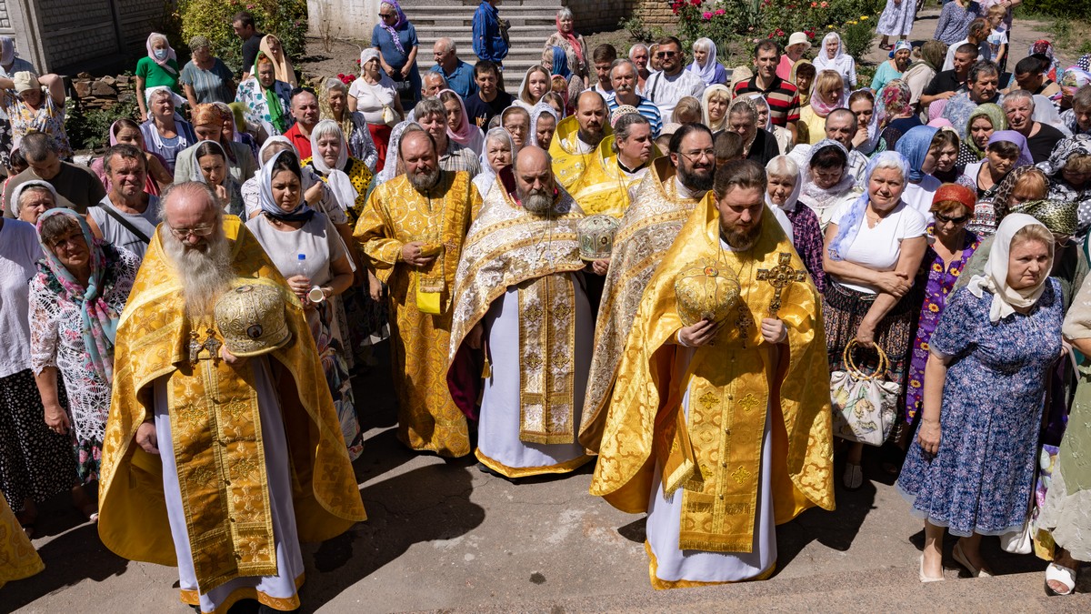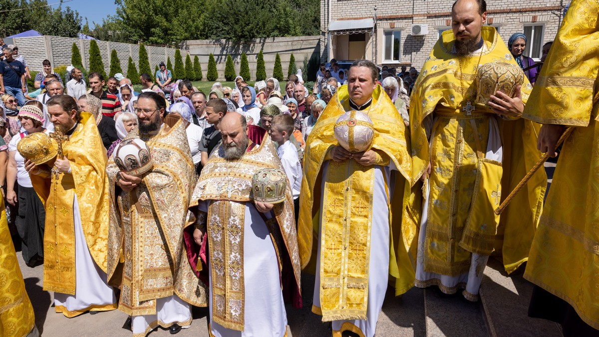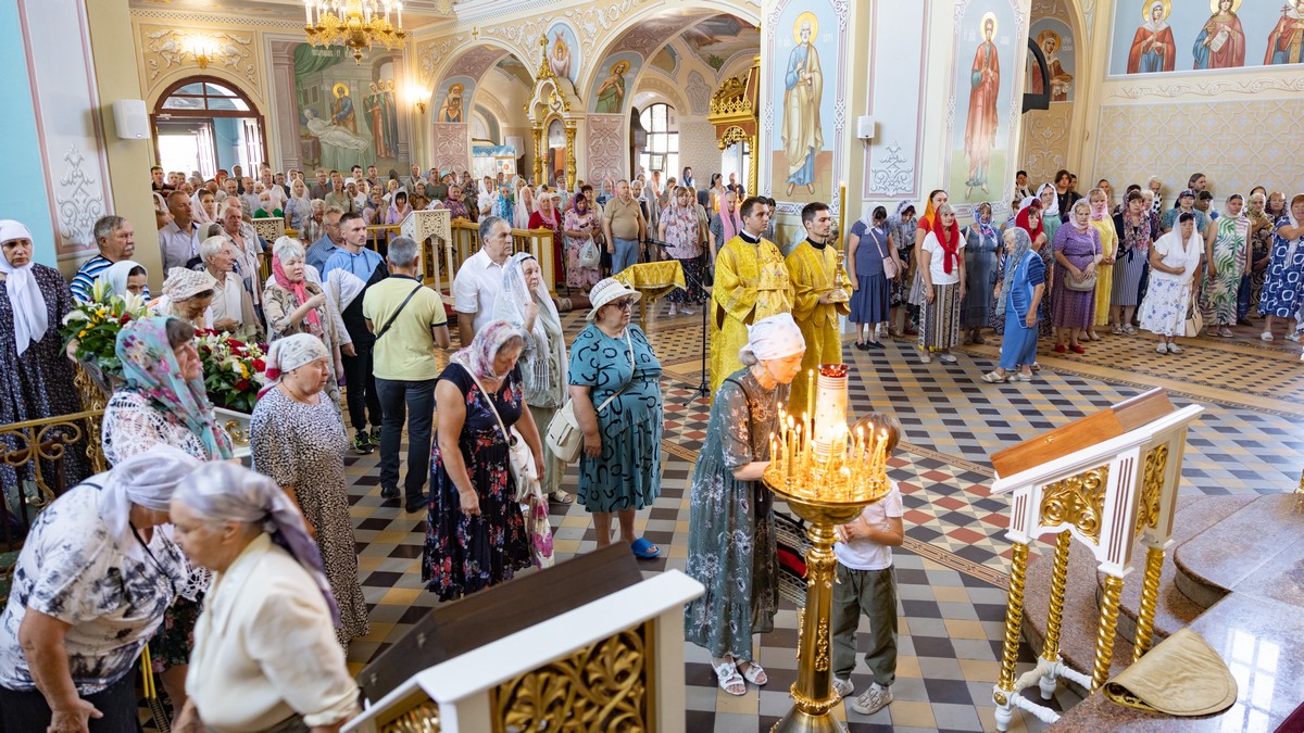 По окончании Божественной Литургии, владыка, духовенство и верующий народ совершили крестный ход вокруг храма, во время которого молились святым покровителям собора.