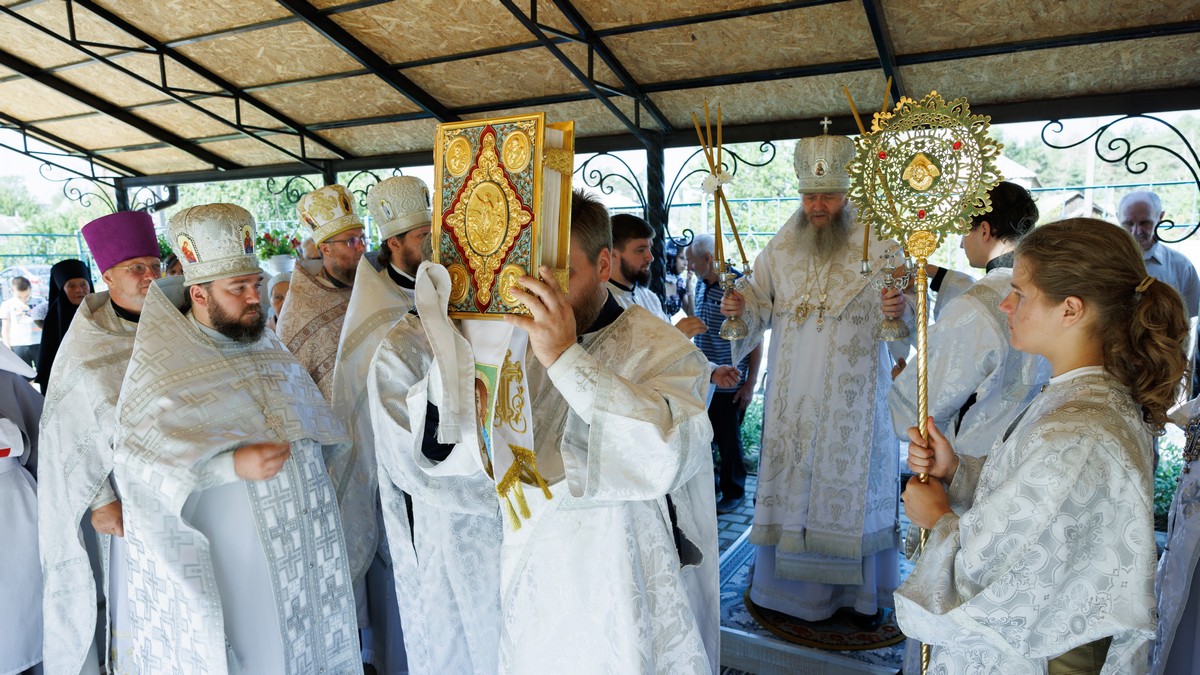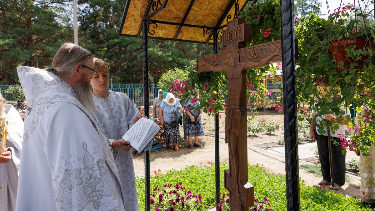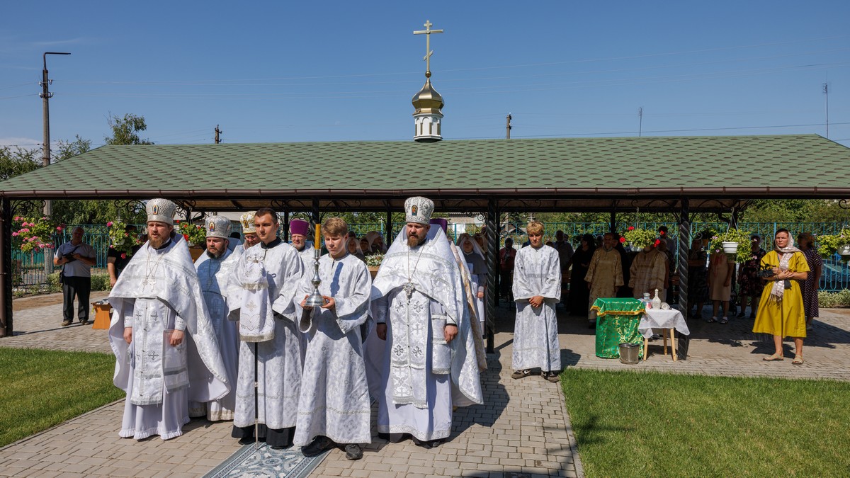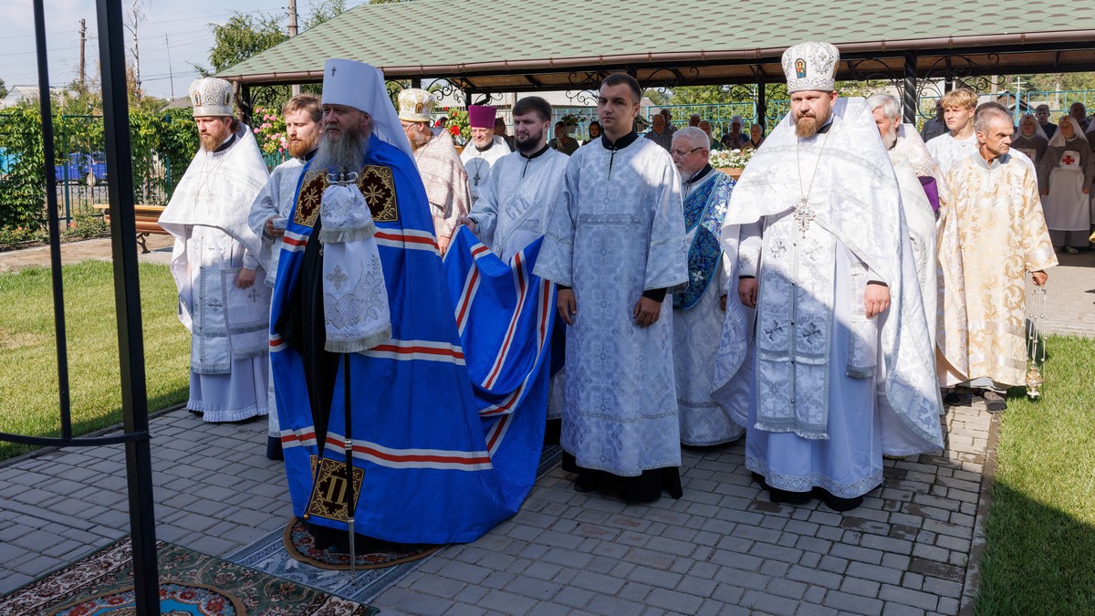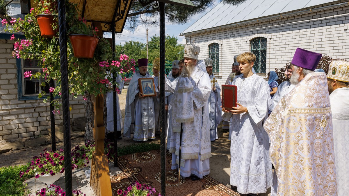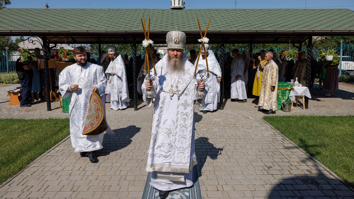По окончании Литургии архипастырь вместе с духовенством и верующим народом совершил крестный ход, во время которого освятил поклонный Крест, установленный в память о жертвах, пострадавших в поселке от боевых действий 2014 года.