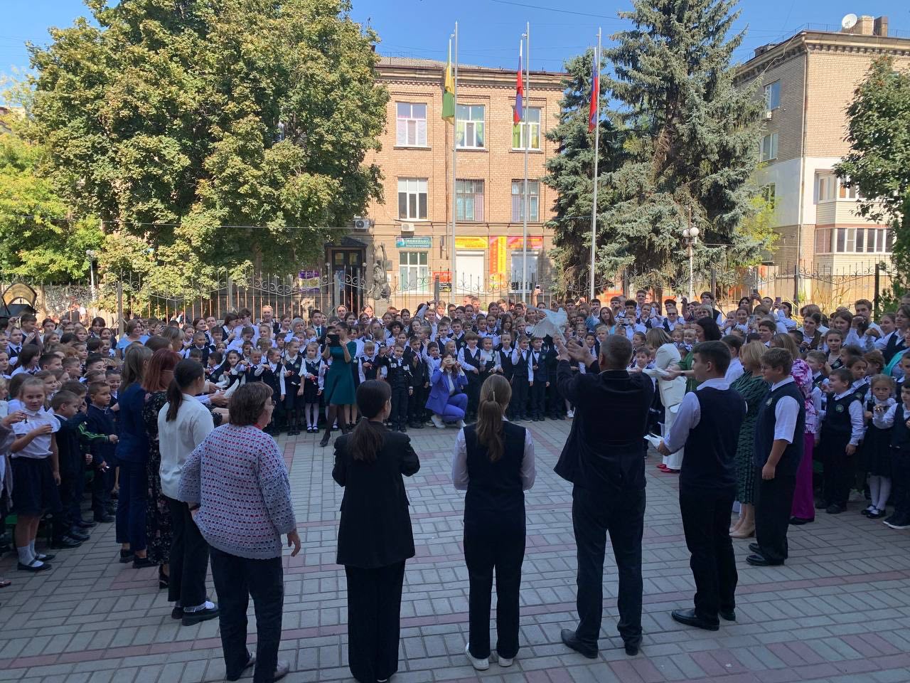 В унисон с колокольным звоном храмов Луганска, педагоги и учащиеся выпустили в небо белых голубей, символизирующих мир, надежду, чистоту и процветание.