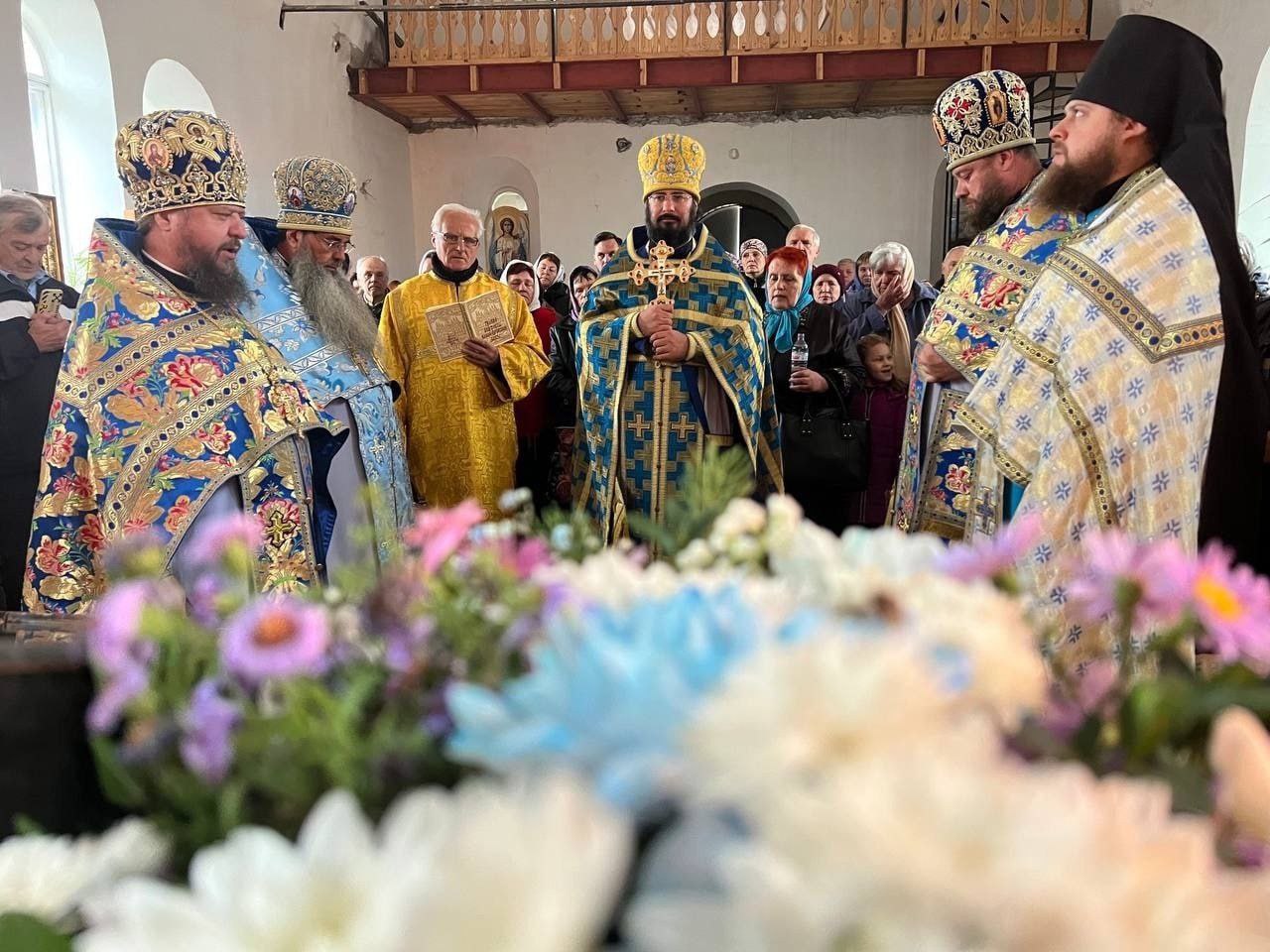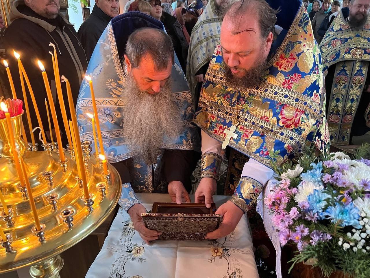 Перед началом Литургии духовенство и верующий народ встретили частицы мощей свв. сщмч. Киприана и мц. Иустины.