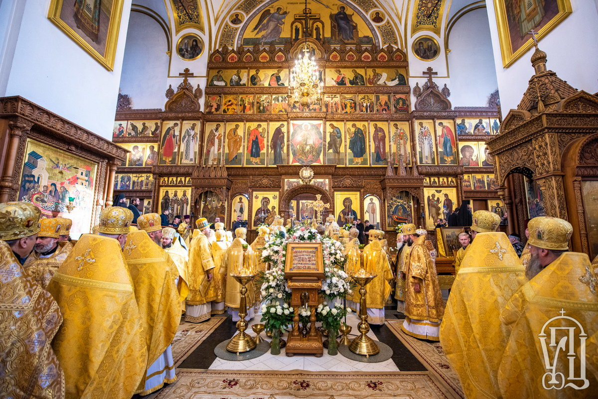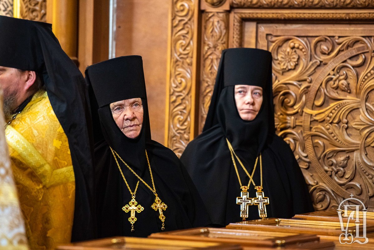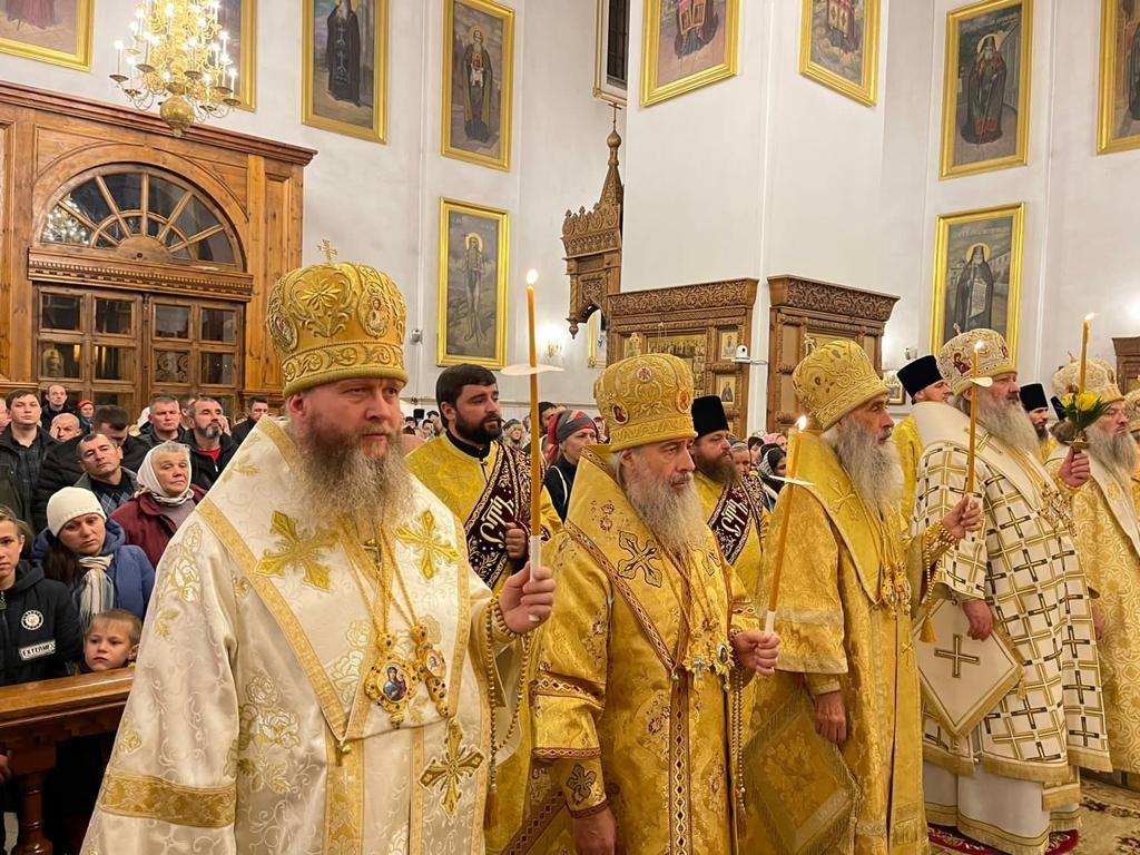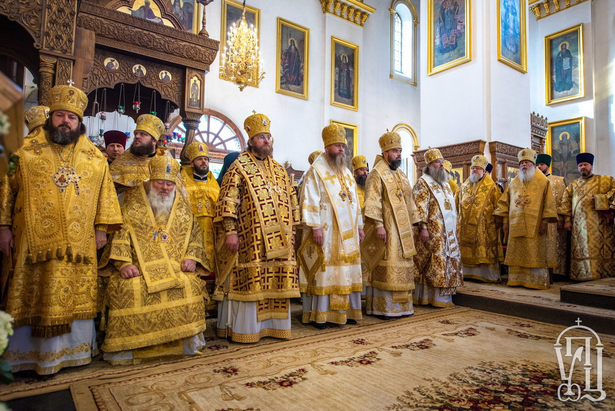За Божественной литургией в Успенском соборе обители Предстоятелю сослужили: митрополит Одесский и Измаильский Агафангел, митрополит Донецкий и Мариупольский Иларион, митрополит Вышгородский и Чернобыльский Павел, архиепископ Перемышльский и Горлицкий Паисий (Польская Православная Церковь), архиепископ Унгенский и Ниспоренский Петр (Православная Церковь Молдовы), митрополиты: Тернопольский и Кременецкий Сергий, Харьковский и Богодуховский Онуфрий, Запорожский и Мелитопольский Лука, Святогорский Арсений, Горловский и Славянский Митрофан, Изюмский и Купянский Елисей, Мукачевский и Ужгородский Феодор, Луганский и Алчевский Пантелеимон, Северодонецкий и Старобельский Никодим, Львовский и Галицкий Филарет; архиепископы: Краснолиманский Алипий, Макеевский Варнава, Бердянский и Приморский Ефрем, Александрийский и Светловодский Боголеп, Южненский Диодор; епископы: Иннокентий (Шестопаль), Хотинский Вениамин, Барышевский Виктор, Белогородский Сильвестр, Добропольский Спиридон, Волновахский Амвросий, Беловодский Павел, Ирпенский Лавр, Бородянский Марк, Новопсковский Иринарх, Константиновский Паисий, духовенство Лавры, Донецкой епархии и гости в священном сане. За богослужением молились настоятельницы монастырей УПЦ и многочисленные верующие.