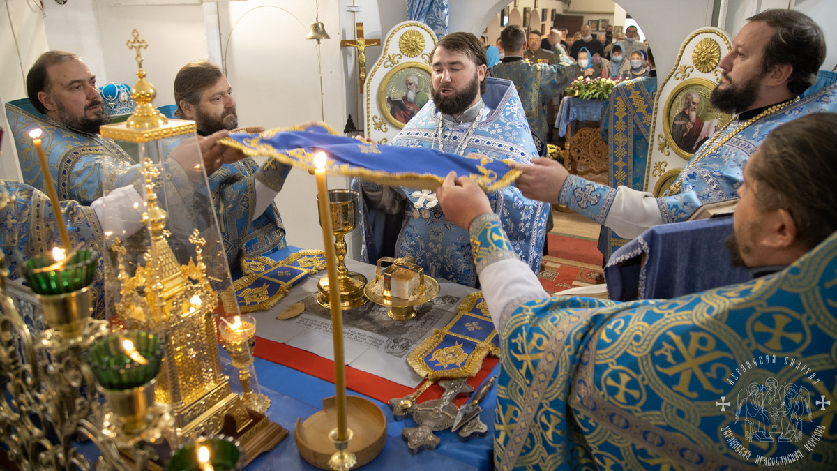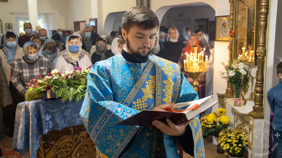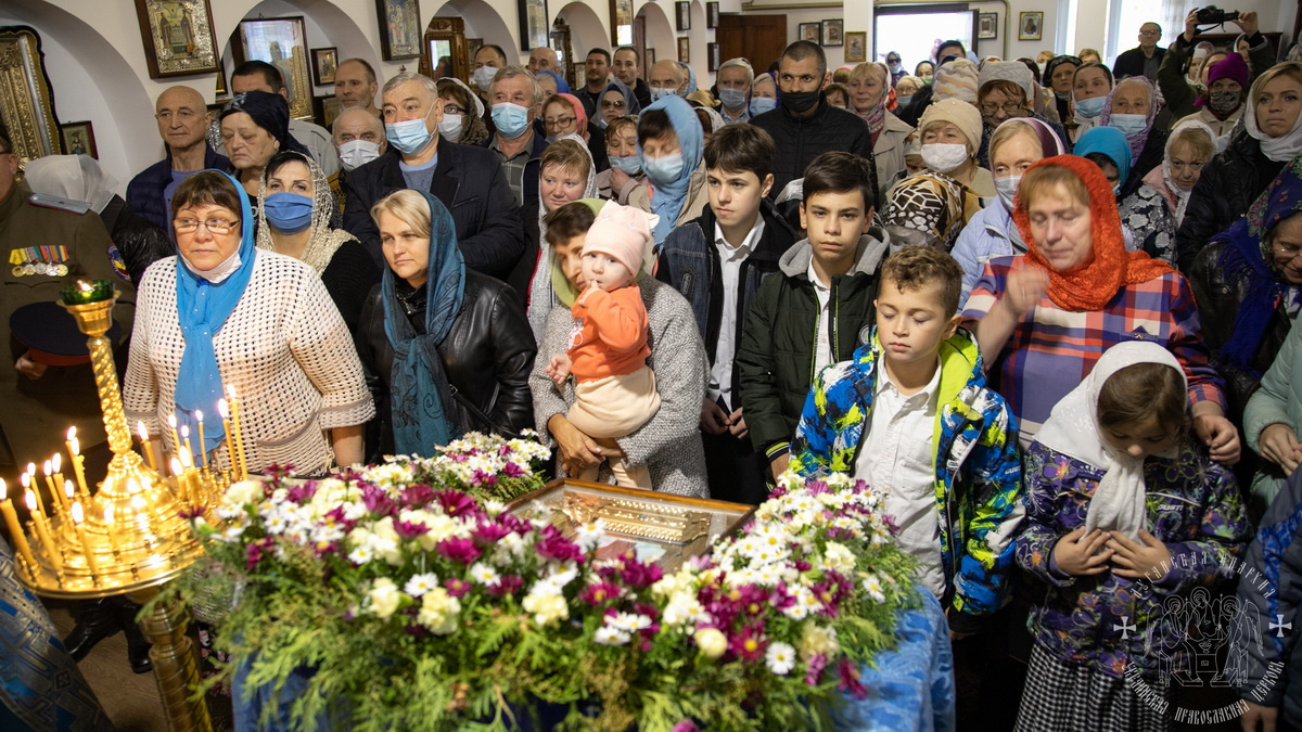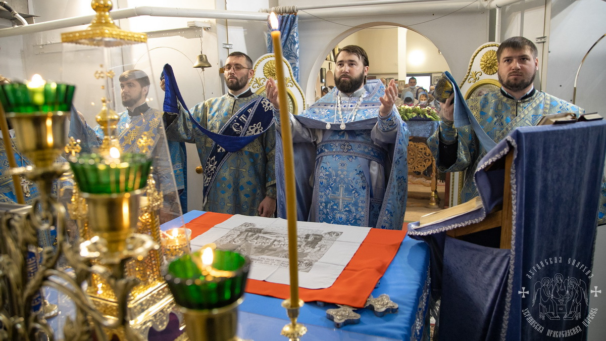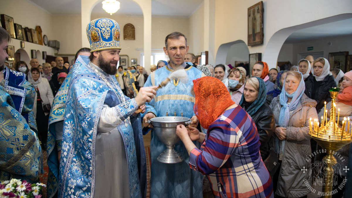 По окончании литургии священнослужители совершили славление празднику Покрова Божией Матери, после чего окропили молящихся святой водой.