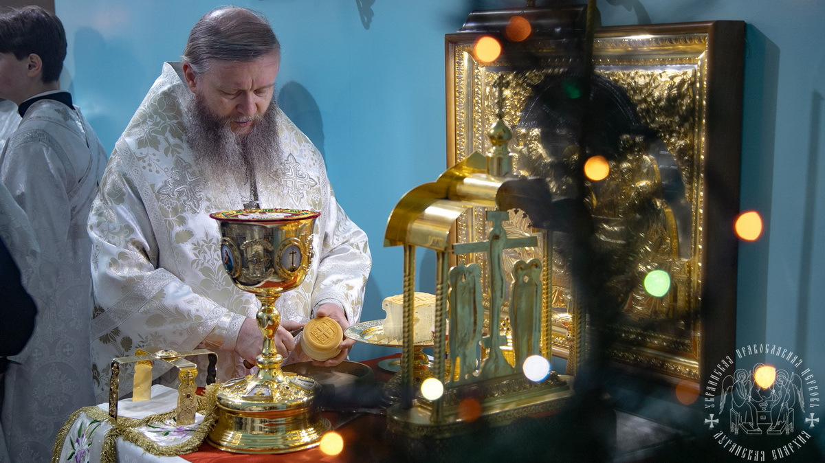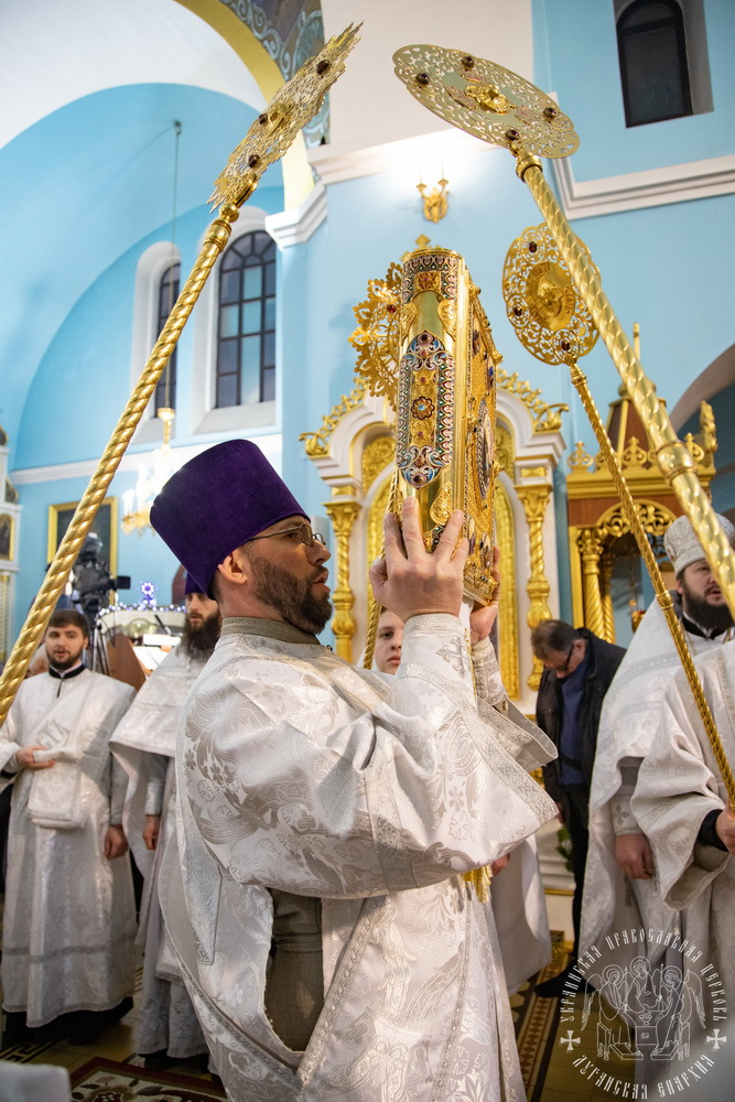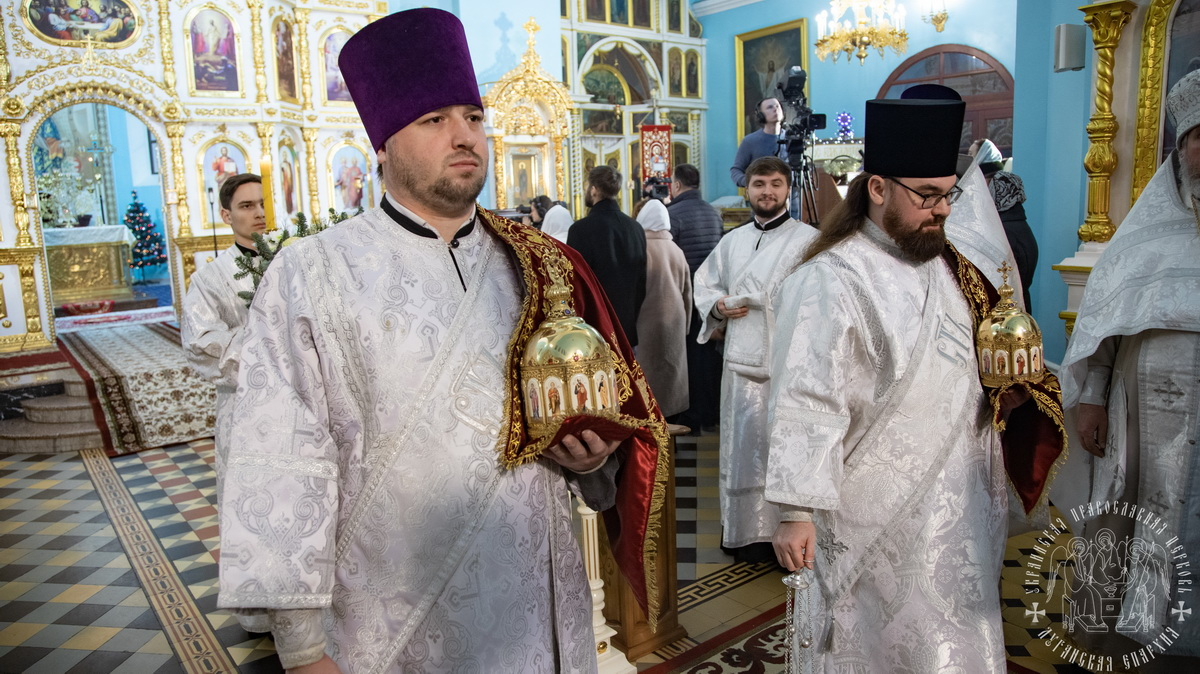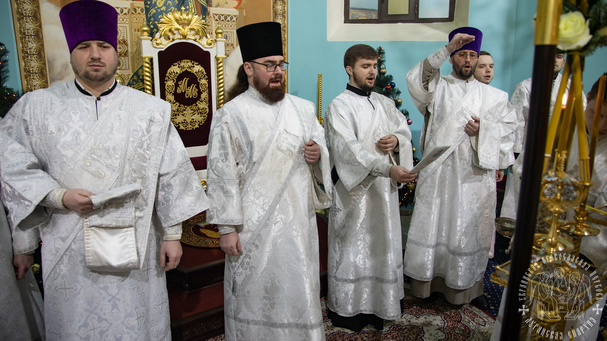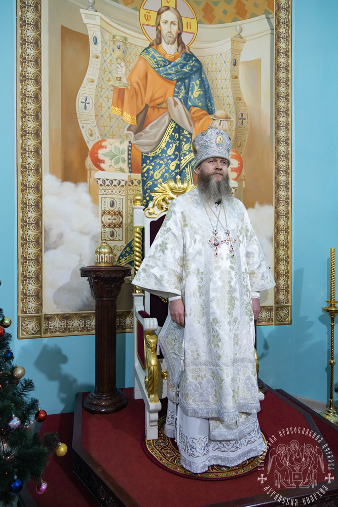 По запричастном стихе, ключарь Свято-Петропавловского кафедрального собора протоиерей Андрей Зозуля, зачитал Рождественское послание Высокопреосвященнейшего Пантелеимона митрополита Луганского и Алчевского.