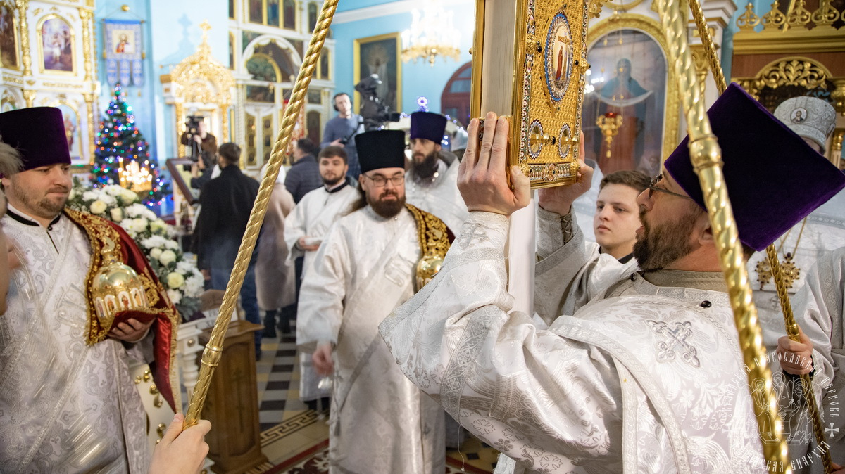 По окончании Божественной литургии Высокопреосвященнейший владыка, вместе с духовенством совершил славление празднику Рождества Христова, а затем, обратился к богомольцам с архипастырским словом.