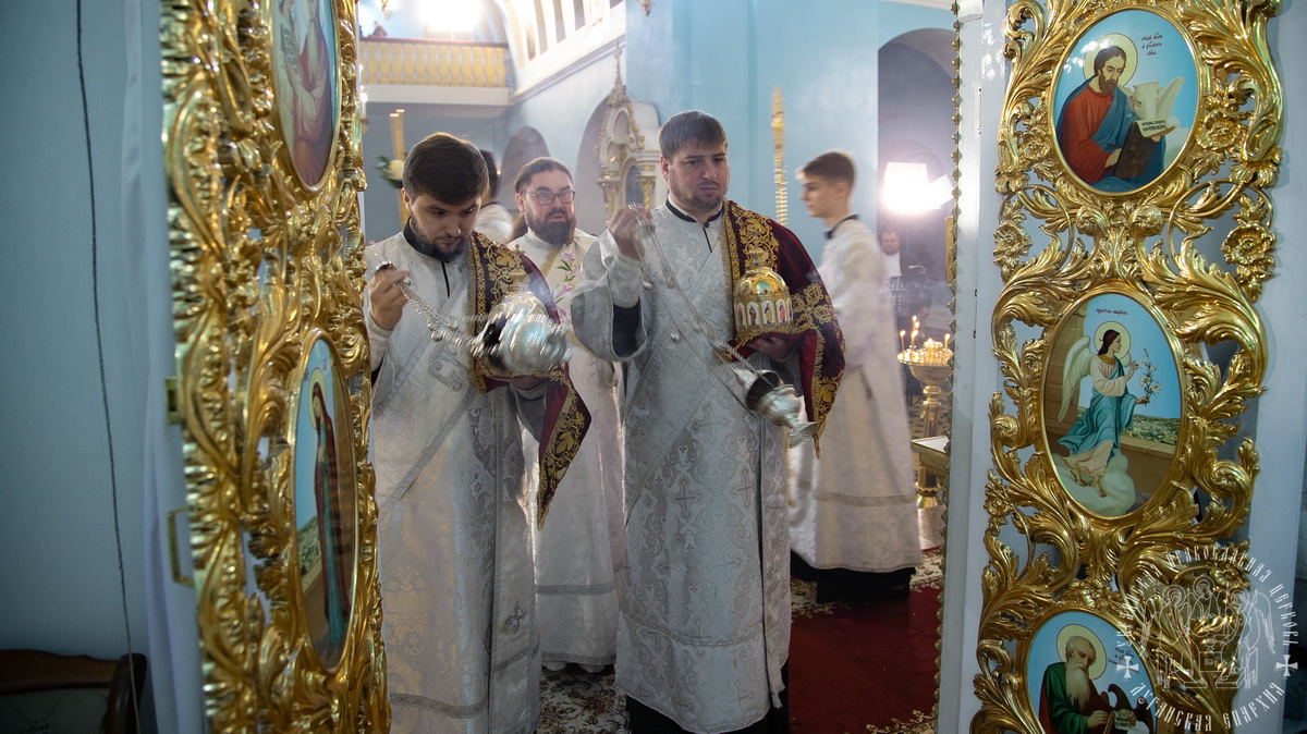 За Божественной литургией его Высокопреосвященству сослужило соборное духовенство.