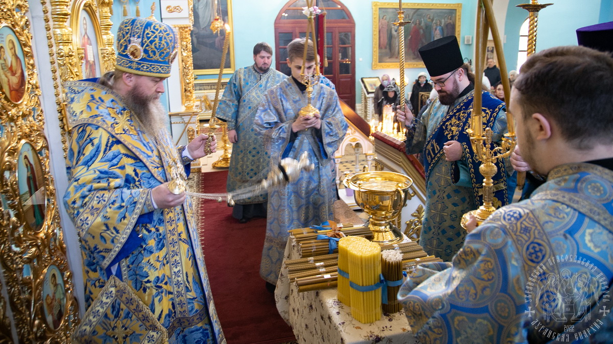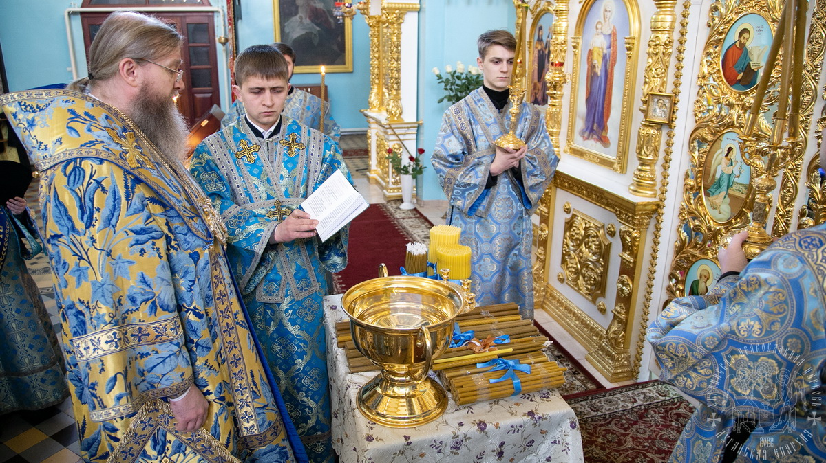 Перед началом Литургии владыка освятил Сретенские свечи.