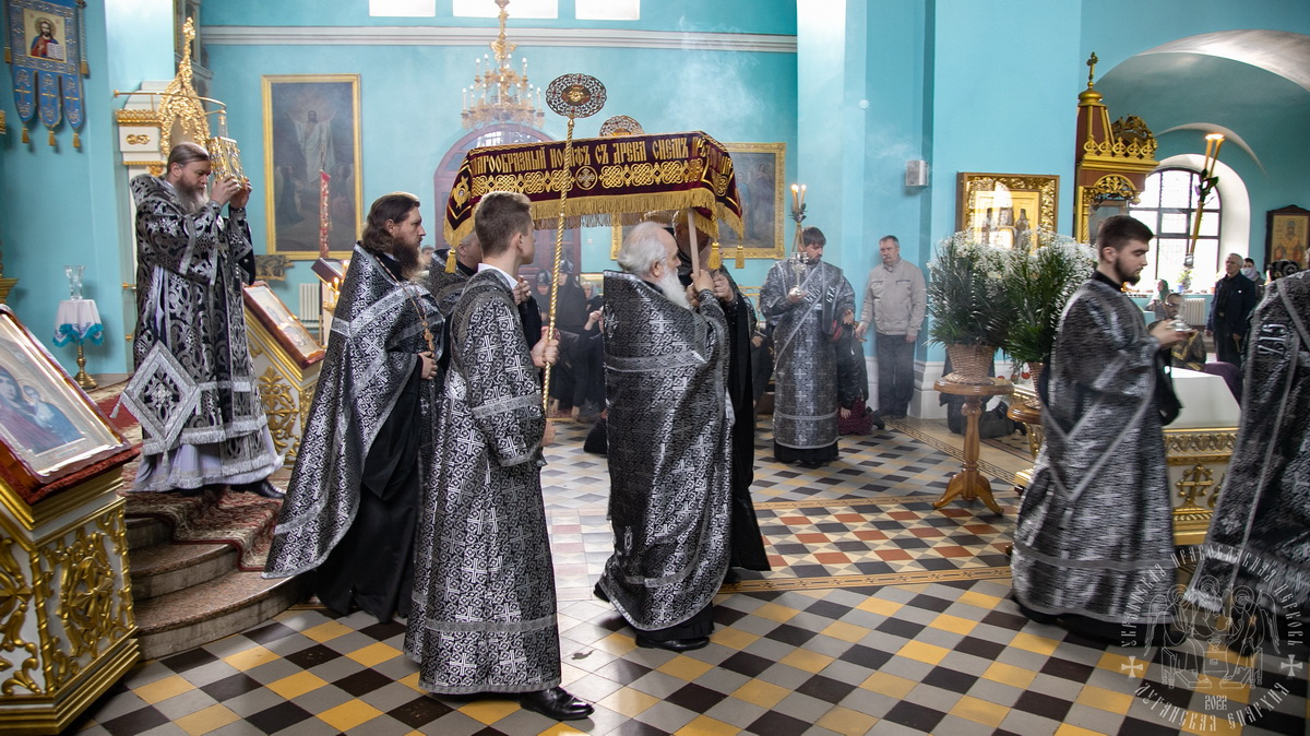 В конце вечерни, при пении тропаря «Благообразный Иосиф, с древа снем Пречистое Тело Твое», из алтаря на середину храма была перенесена Святая Плащаница с изображением Христа.
