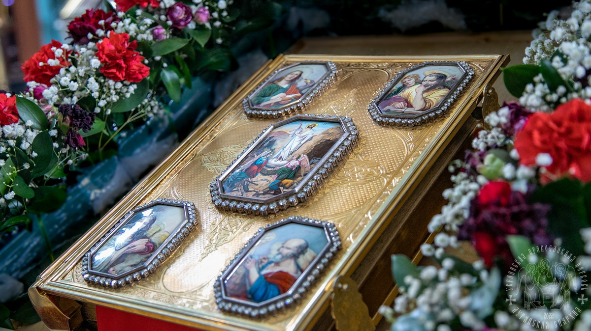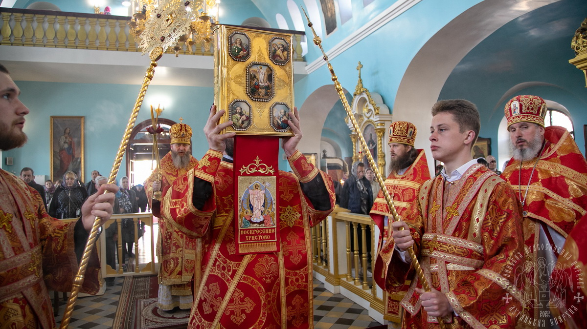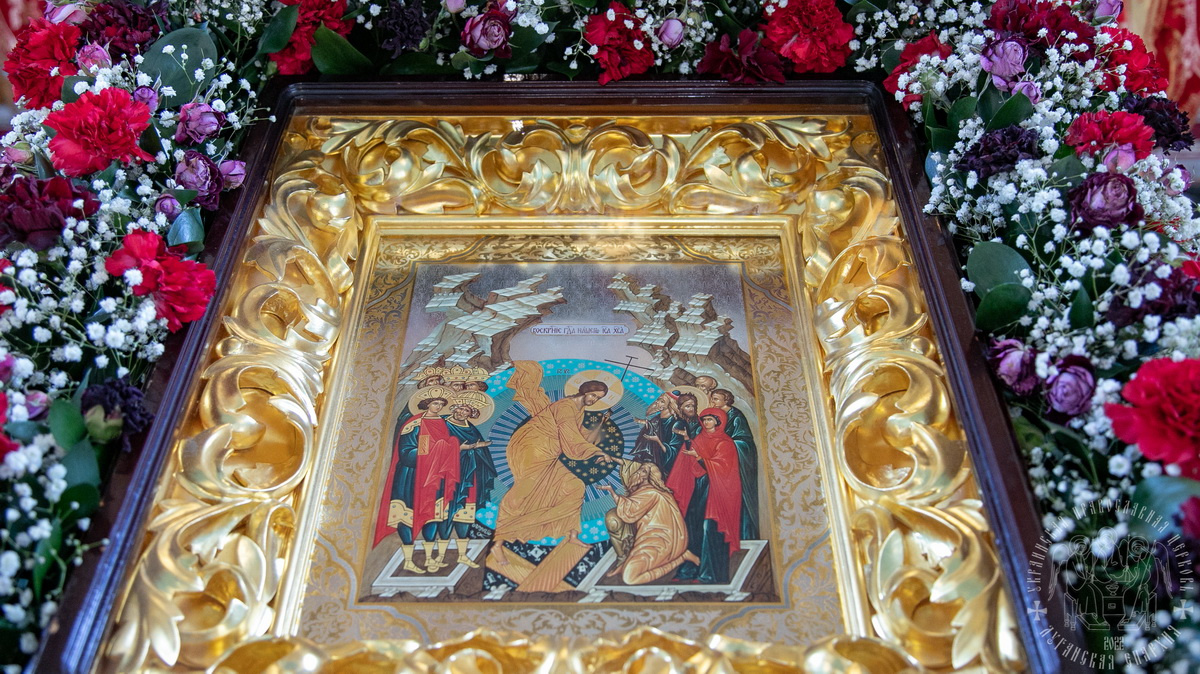 По окончании Литургии, архипастырь вместе со священнослужителями совершил славление Воскресению Христову у иконы праздника.