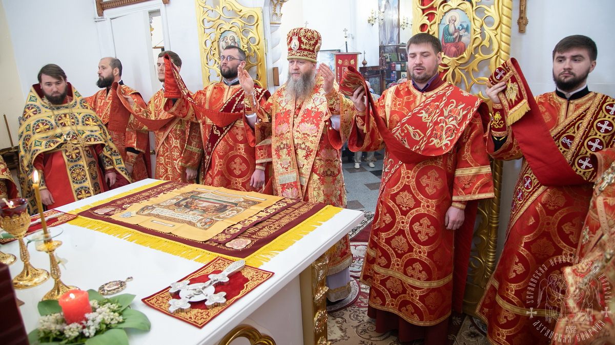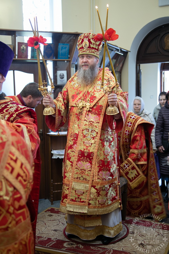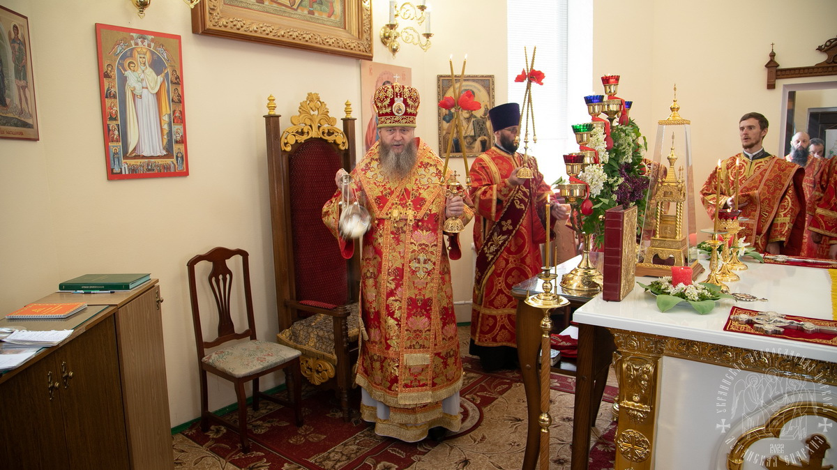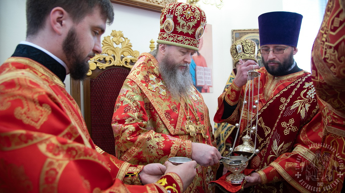 После сугубой ектении архипастырь вознес молитву о Церкви, о мире и умножении любви среди народа Отечества нашего и молитву «во время распространения вредоносного поветрия».