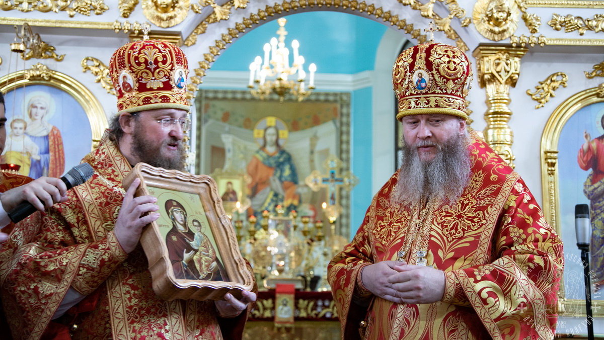 По окончании Богослужения, к владыке Пантелеимону, обратился митрополит Никодим: « Мы сегодня собрались здесь, под сводами этого древнего собора, что бы вместе с вами, дорогой владыка, разделить радость ваших именин. Уже десять лет вы несете свое архипастырское служение на земле Донбасса, и все эти годы, вы стараетесь, что бы слова Спасителя, о любви, которыми начиналось сегодняшнее Евангелие, в полной мере воплощались в вашей жизни. И в этом помогает вам ваш небесный покровитель. Он был не только мучеником, воином, но он был еще и врачом. Многие люди приходили к нему за исцелением. И они получали его безвозмездно. Вы, владыка, подражаете примеру своего небесного покровителя, вы стараетесь творить добрые дела, не получая и не прося ничего взамен». Владыка Никодим вручил имениннику богослужебную просфору и образ Божией матери «Одигитрия».