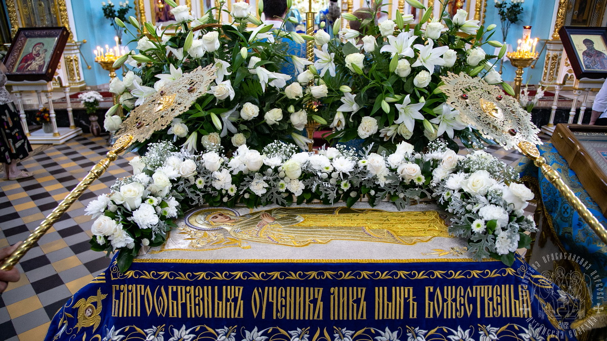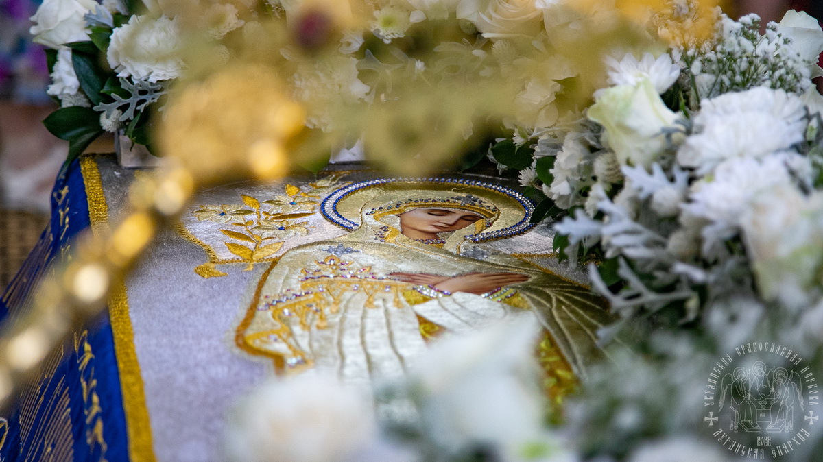 По окончании Литургии священнослужители совершили славление Пресвятой Богородице у Ее святой Плащаницы.