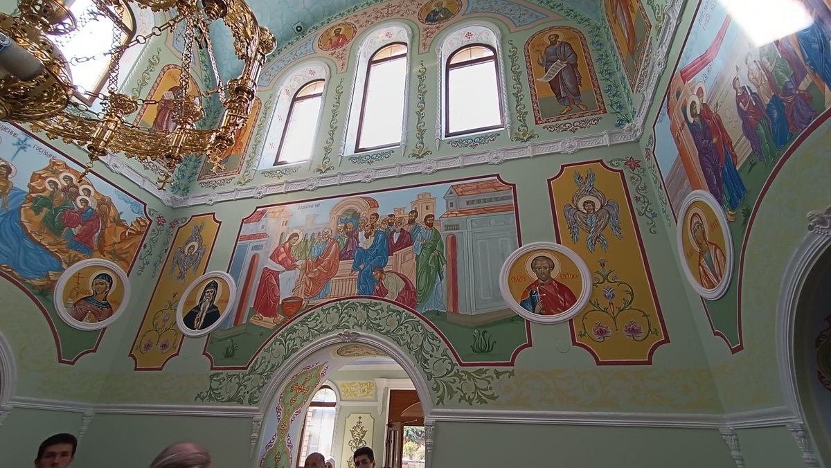 В продолжение визита в Алчевское благочиние, гости праздника посетили храм Святого Духа в поселке Алексеевка, где ознакомились с ходом внутренних работ по росписи храма.