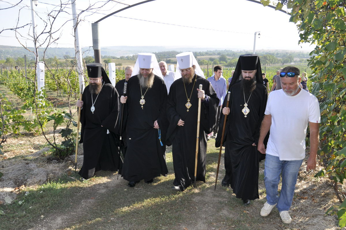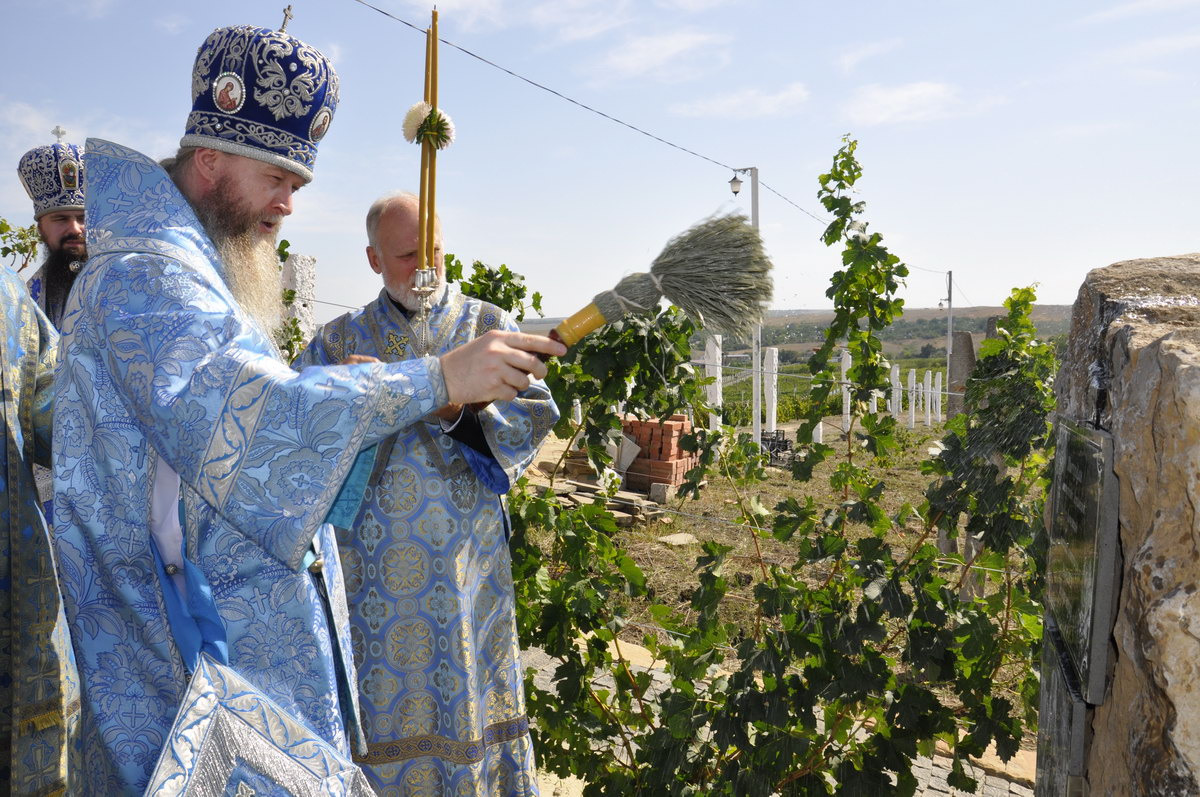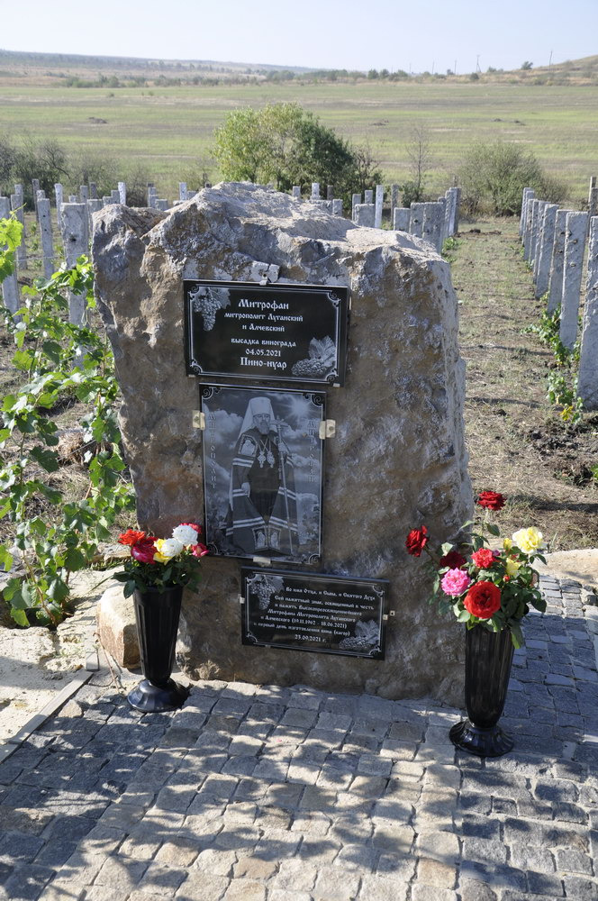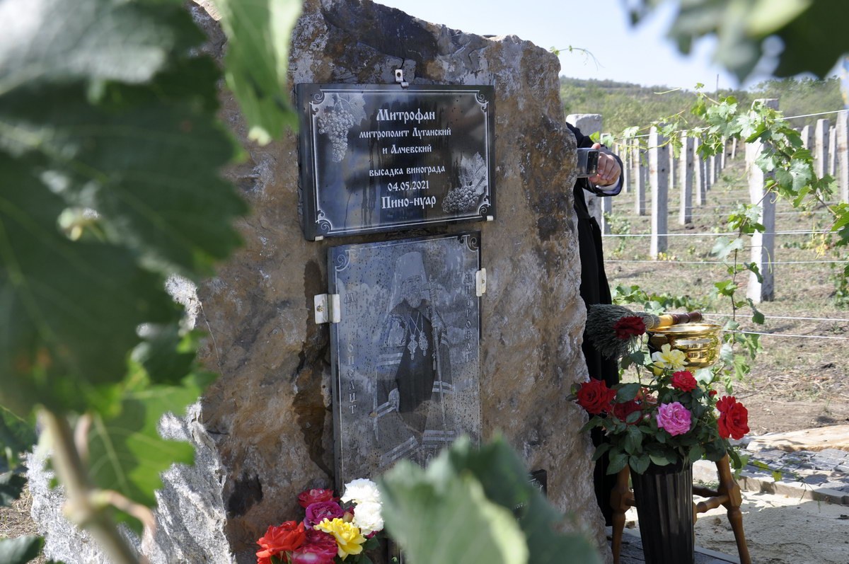 Затем все участники соборной молитвы прошли к памятному знаку, установленному в память о митрополите Митрофане, который неоднократно посещал это место, совершал богослужения, освящал виноградник и принимал участие в высадке новых сортов.