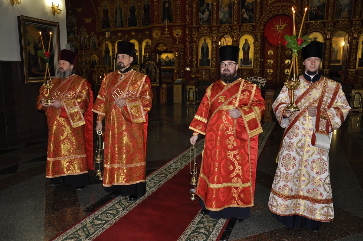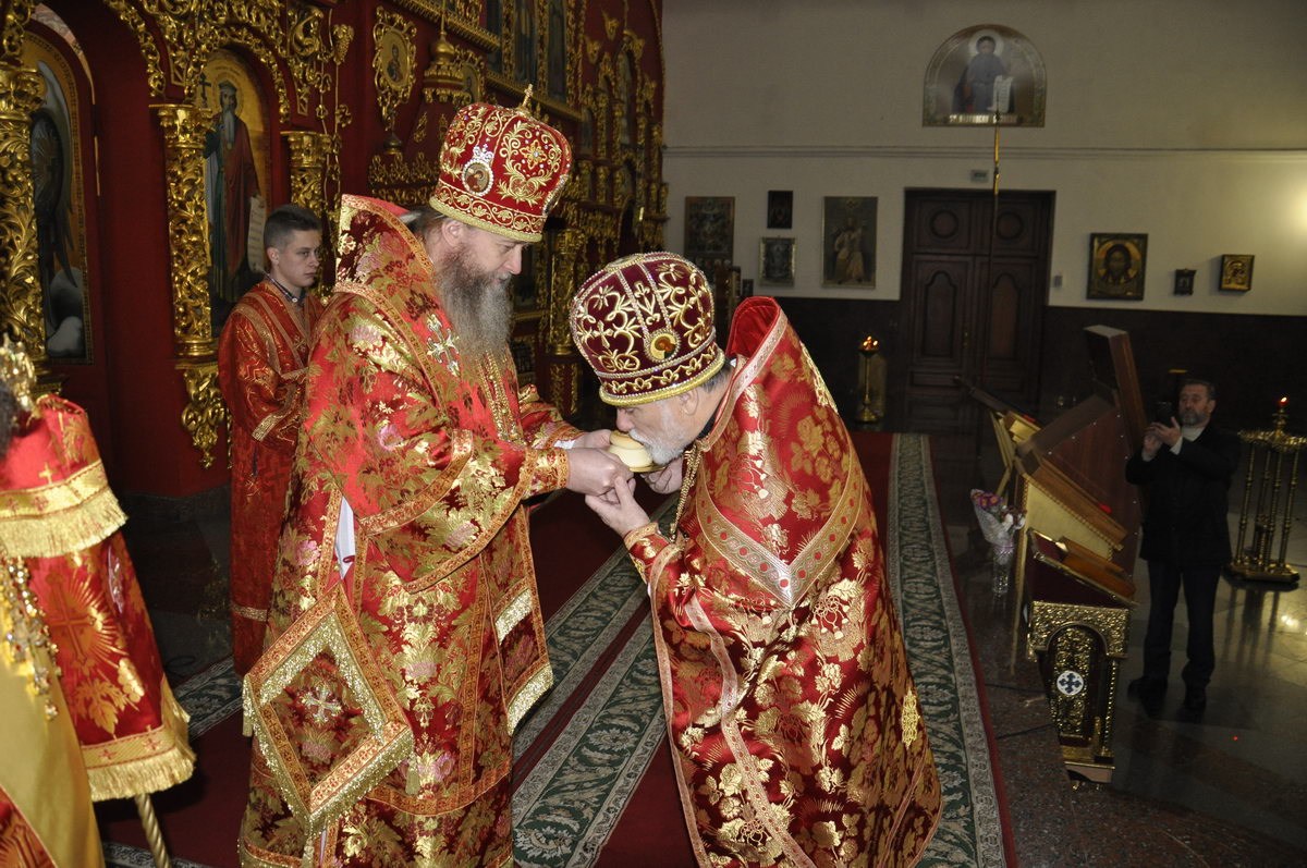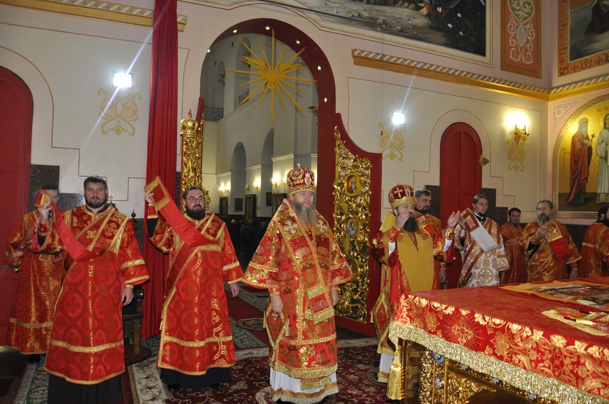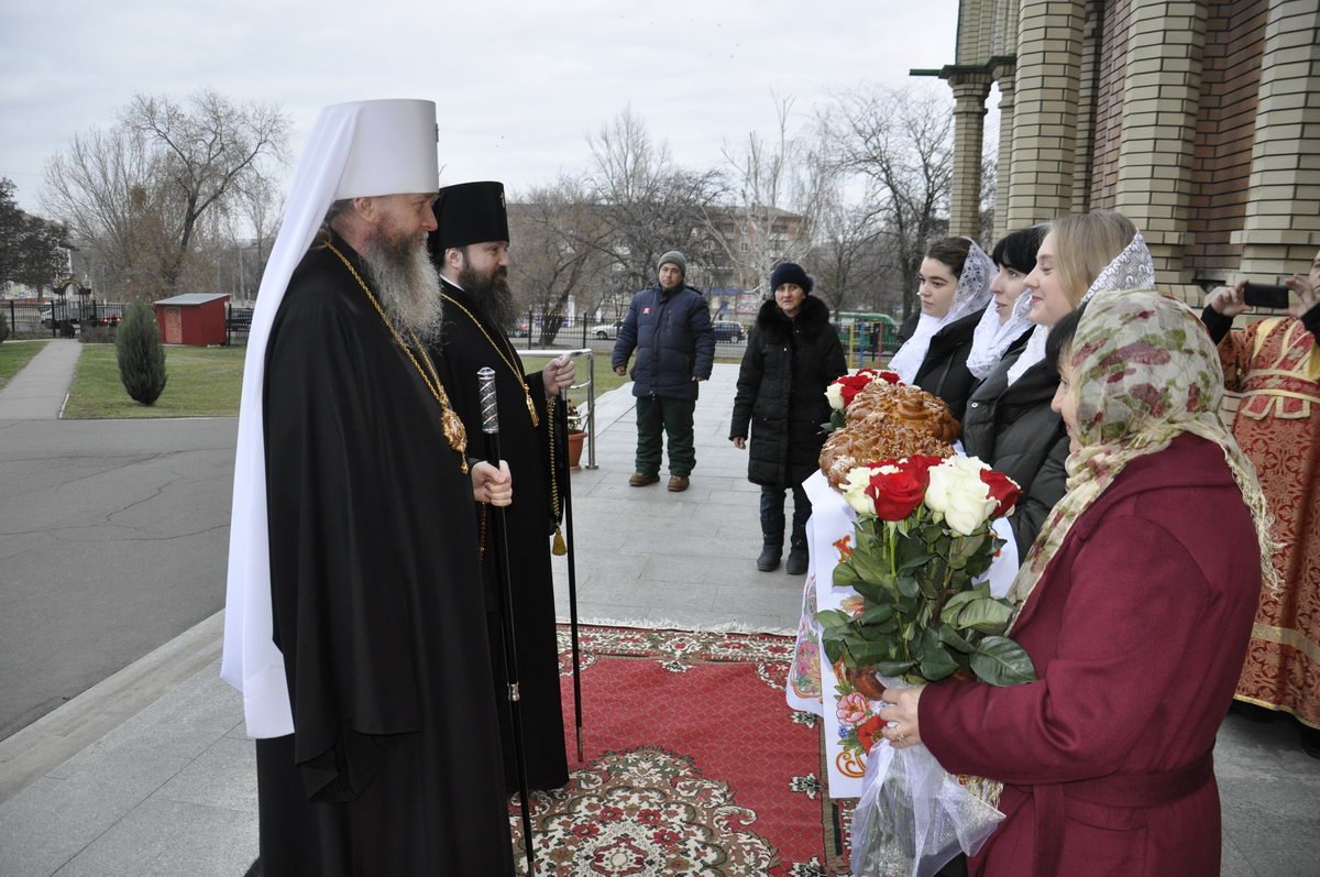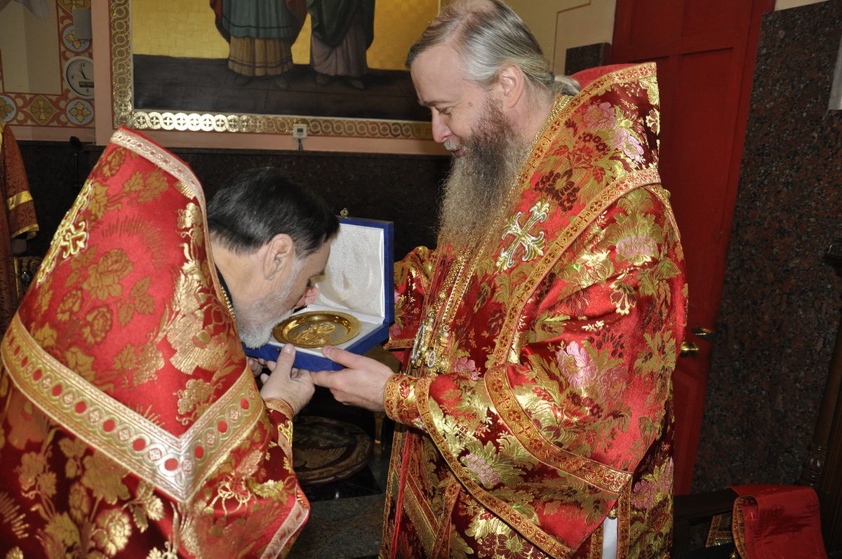 По окончании богослужения, владыка Пантелеимон поздравил настоятеля собора с его Днем рождения, пожелав долгих благословенных лет жизни.