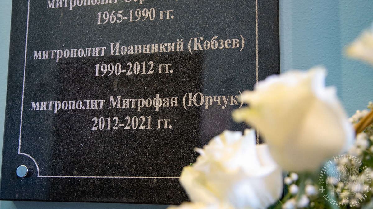 По завершении заупокойного богослужения священнослужители возложили корзину белых роз к мемориальной таблице с именами почивших святителей, установленную в притворе кафедрального собора.