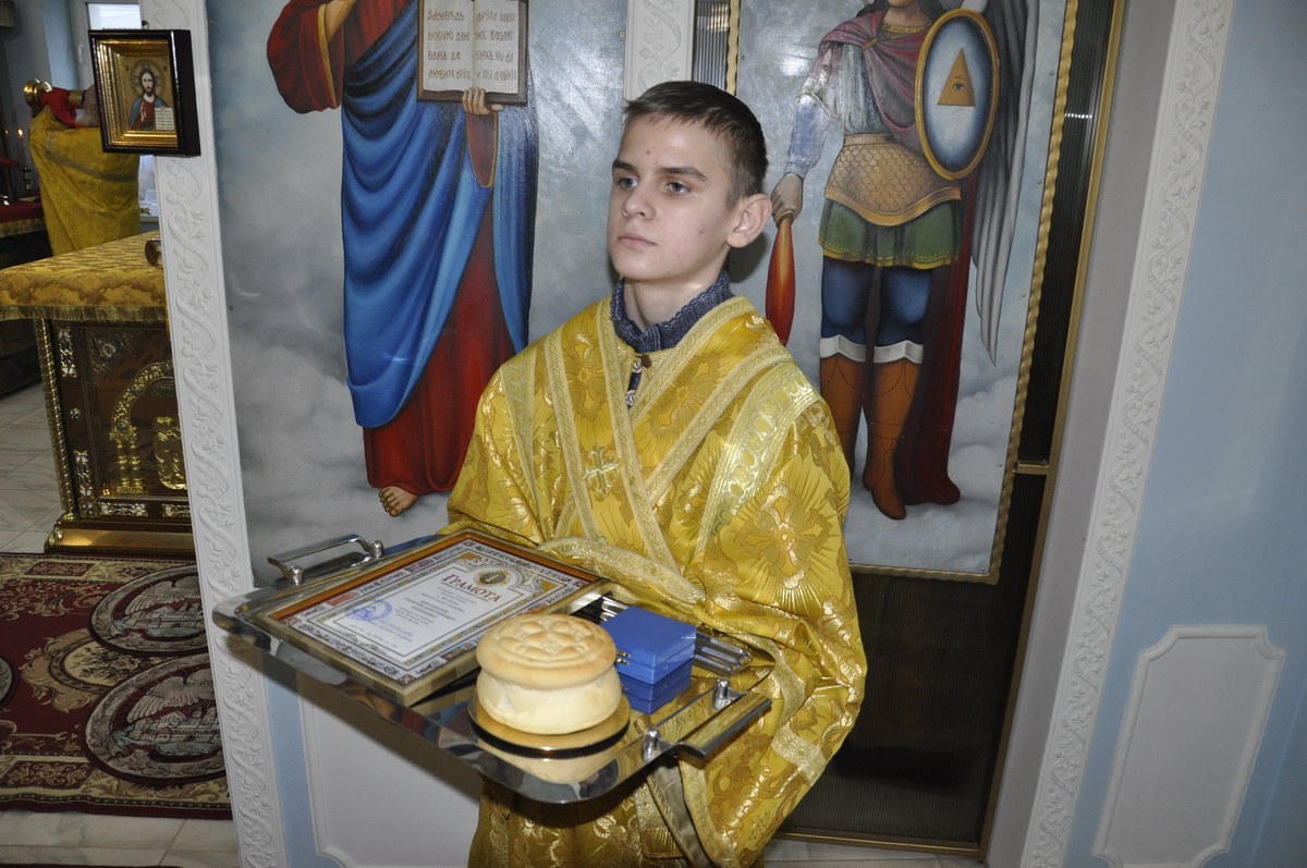 По окончании Литургии митрополит Пантелеимон поздравил настоятеля храма прот. Григория Акименко с 30 – летием служения в священном сане, преподал ему богослужебную просфору и вручил орден Луганской иконы Божией Матери.